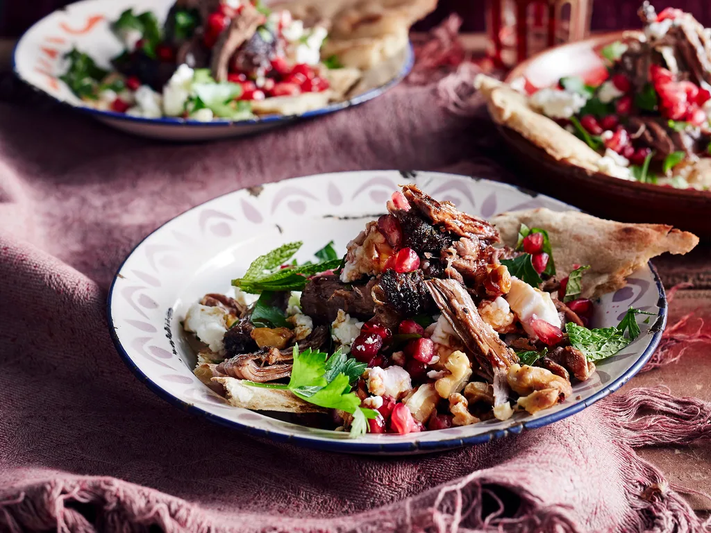POMEGRANATE Get those little seeds out of the fruit and they are yours for the eating…or adding to recipes. Sprinkle some over this Moroccan lamb salad (pictured) for a burst of freshness. Or try these sticky pomegranate chicken wings. Or go down a sweet route. These pomegranate and strawberry custard tarts are easy to make. Or try these elegant rhubarb, pear and pomegranate custard tea cakes. Serve them warm with cream.
