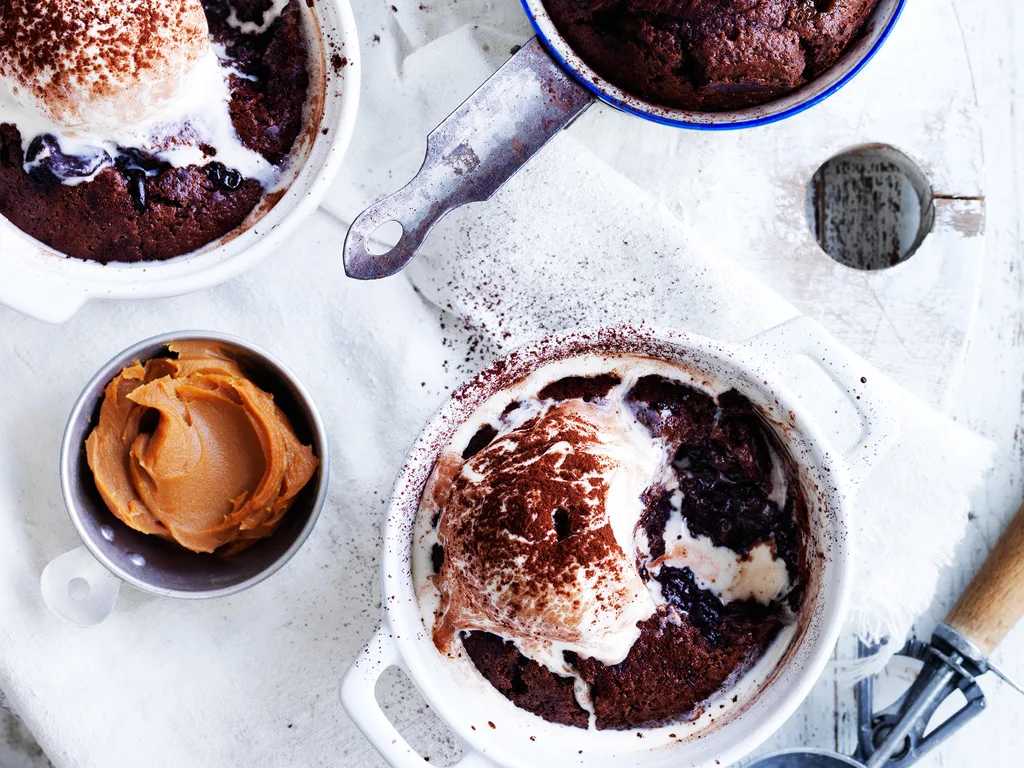 Warm chocolate pudding cakes with a molten chocolate core served with mascarpone coffee ice-cream make an elegant yet indulgent dessert.