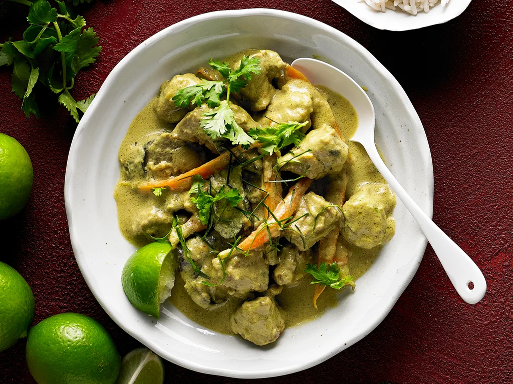 A quick dinner recipe of tender pork meatballs in a mild curry sauce and just-cooked green beans.