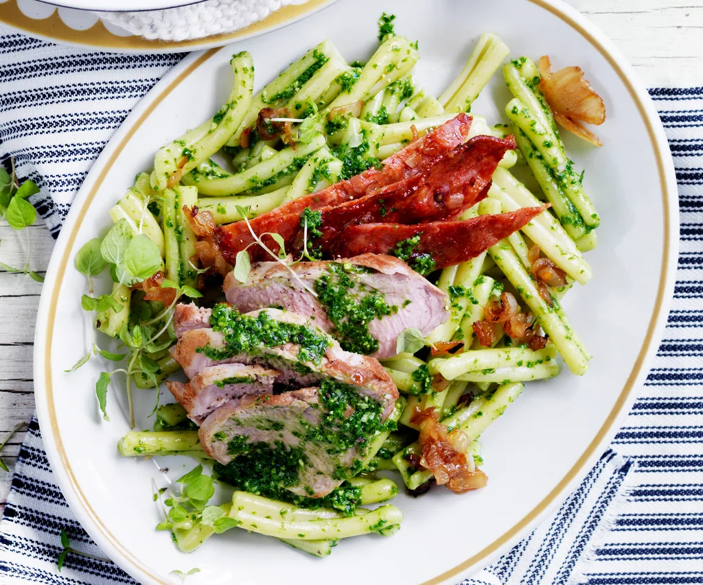 Apricot and mint stuffed pork with rocket, mint and radish salad