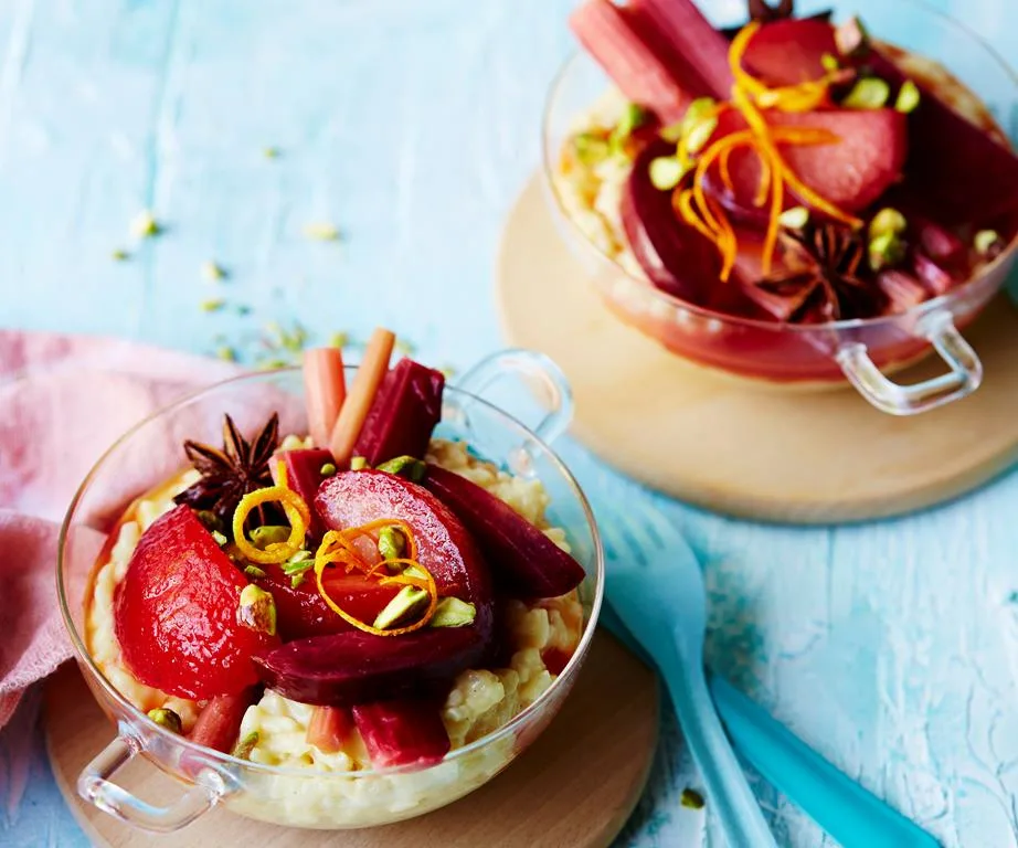 This vegan rice pudding is rich and creamy thanks to non-dairy milk and coconut syrup. Bursting with fruity flavours, this dairy free dessert is topped off with nutty roasted pistachios, zesty orange rind and sweet poached rhubarb, with plums for a vibrant touch.