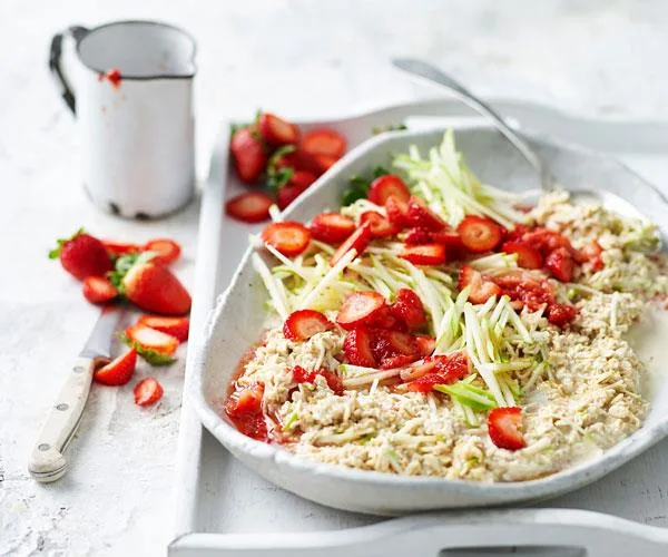 Sweetened with apples, maple syrup and muddled strawberries, this healthy breakfast option can make mornings easier by doing most of the prep the night before. Make double the oats Sunday night and you can enjoy it all week. For a dairy-free option, use almond milk.