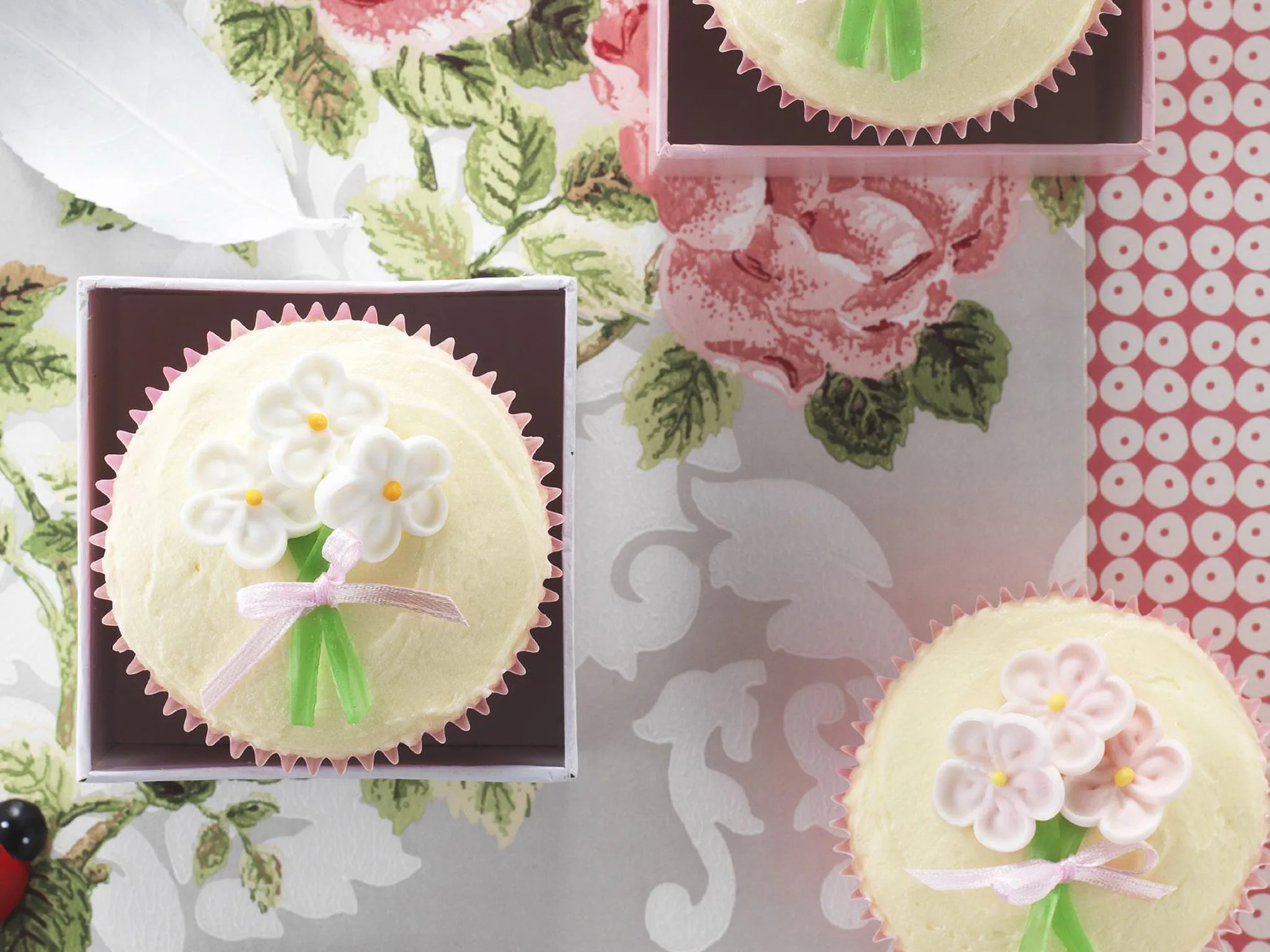 5.Make stems for the flowers by cutting thin strips about 3cm long from snakes. Tie a piece of ribbon around each bunch of stems and place on cakes. Position flowers on top of stems.