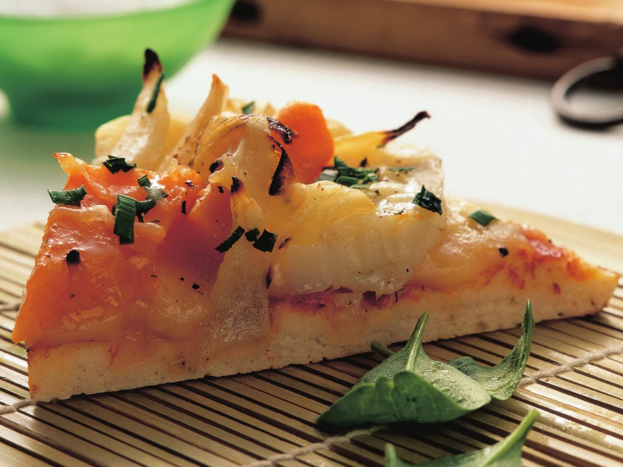 4.Top pizza base with cheese, onion mixture, kumara, potato and remaining oregano.