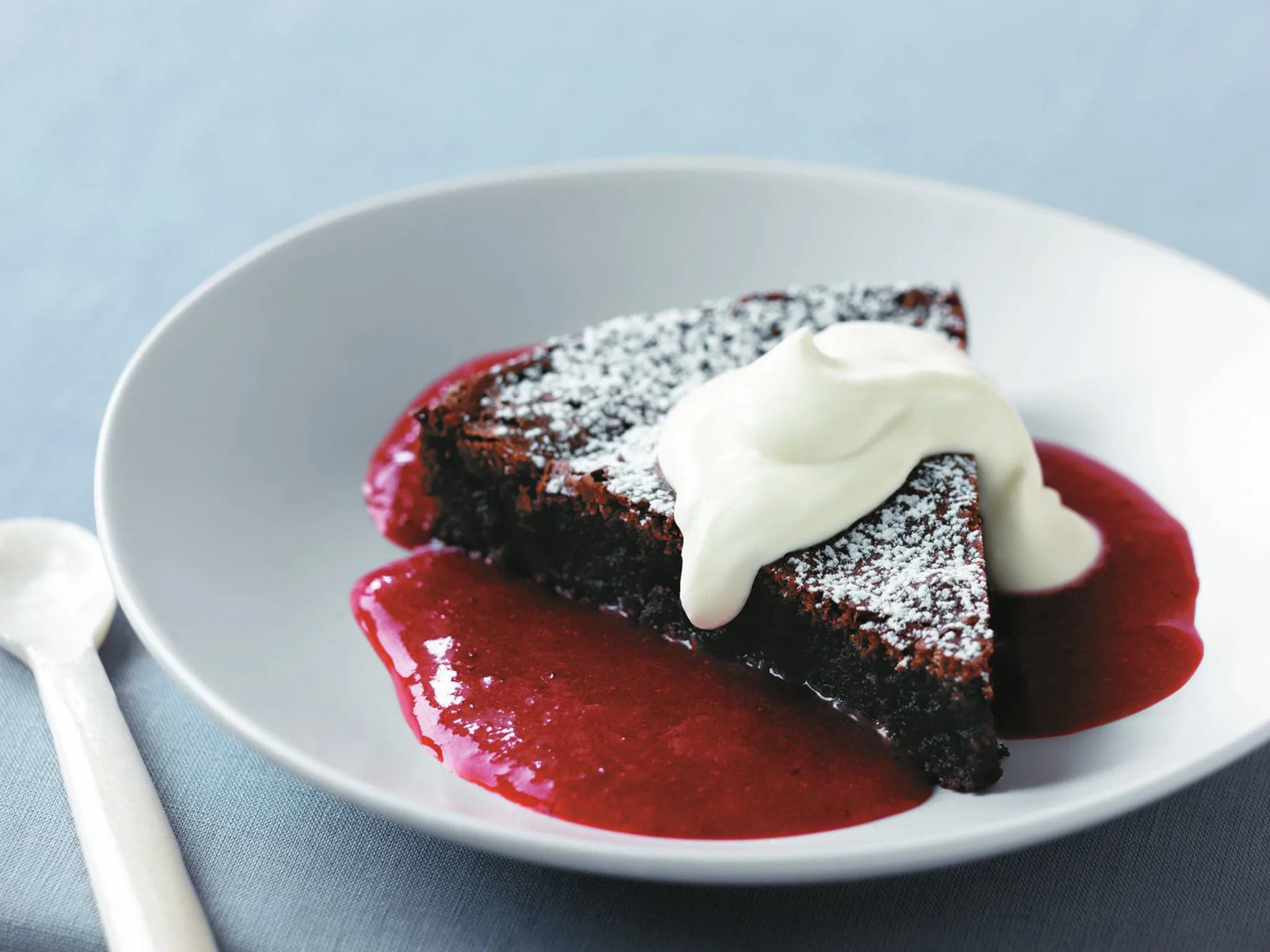 7.Carefully turn cake onto board; cut into slices with a hot knife. Dust cake with sifted icing sugar; serve with strawberry coulis and whipped cream, if desired.