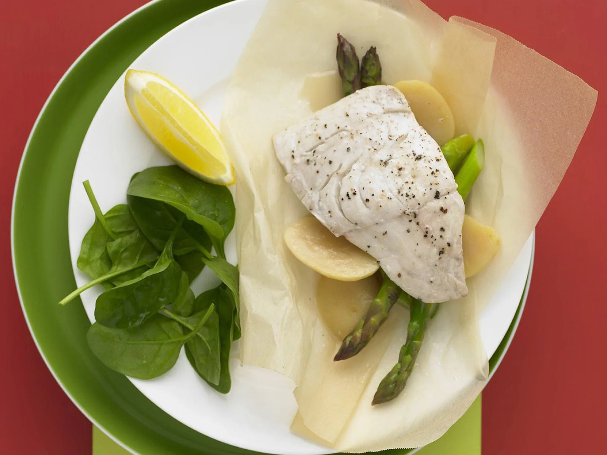3.Place four large squares of baking paper on top of four large squares of foil. Layer potato and asparagus on squares; top with fish. Drizzle with juice and oil; season.