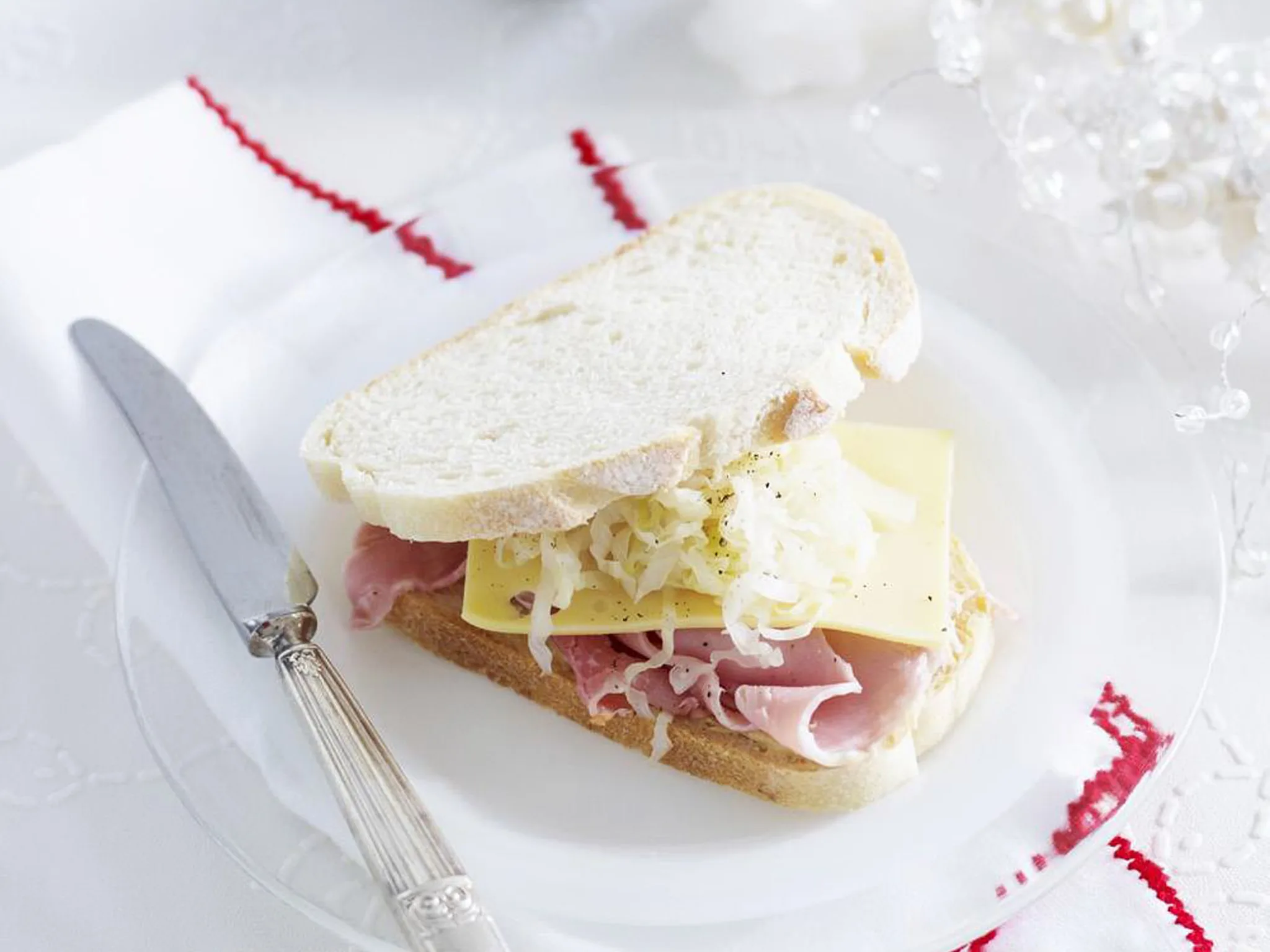1.Spread 8 slices sourdough with dijon mustard top 4 sourdough slices with drained sauerkraut, sliced ham and sliced swiss cheese. Season, top with remaining sourdough slices.