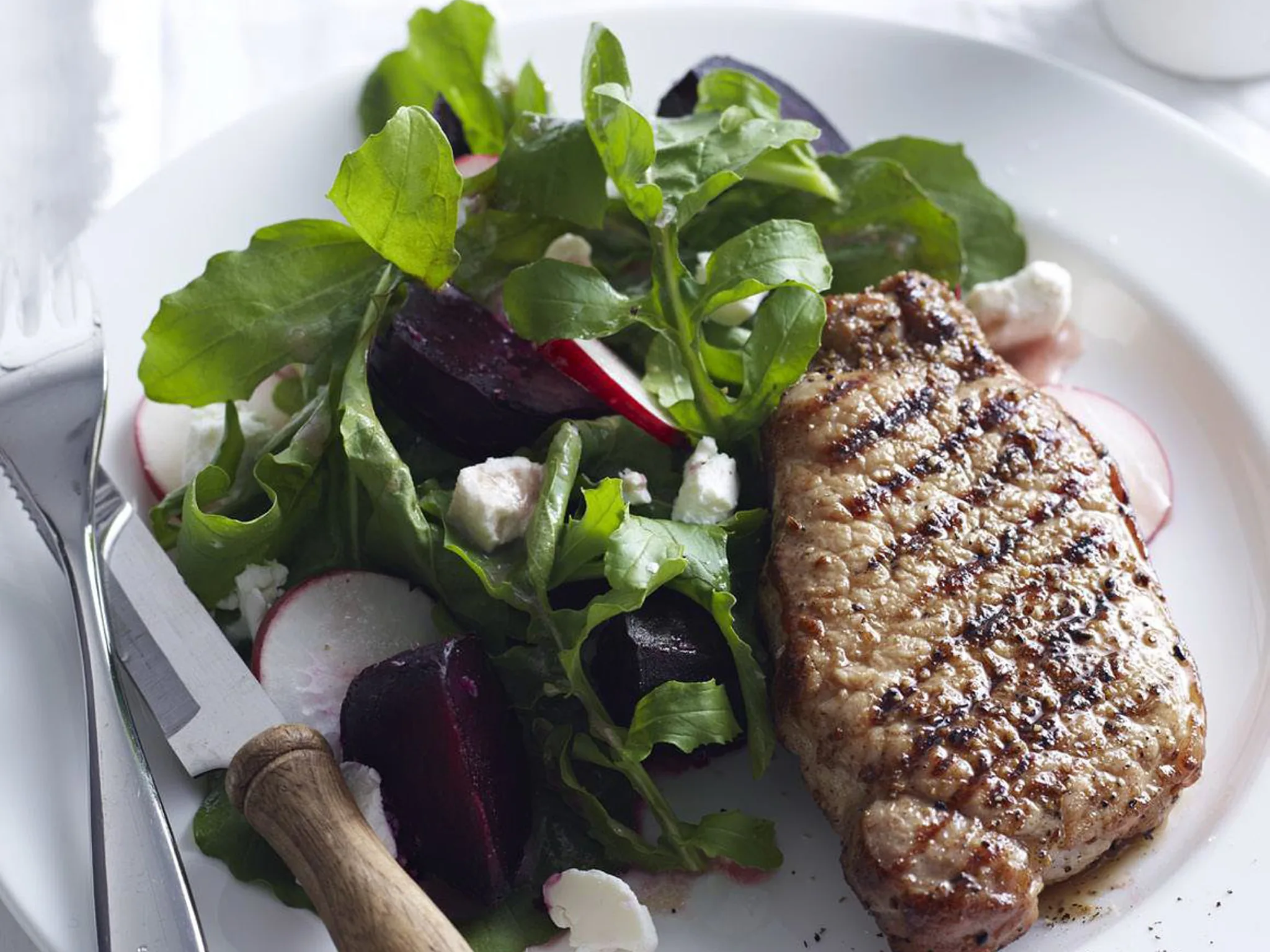 5.Place beetroot, cheese, radish and rocket in large bowl with vinaigrette, toss gently to combine. Serve salad with pork.