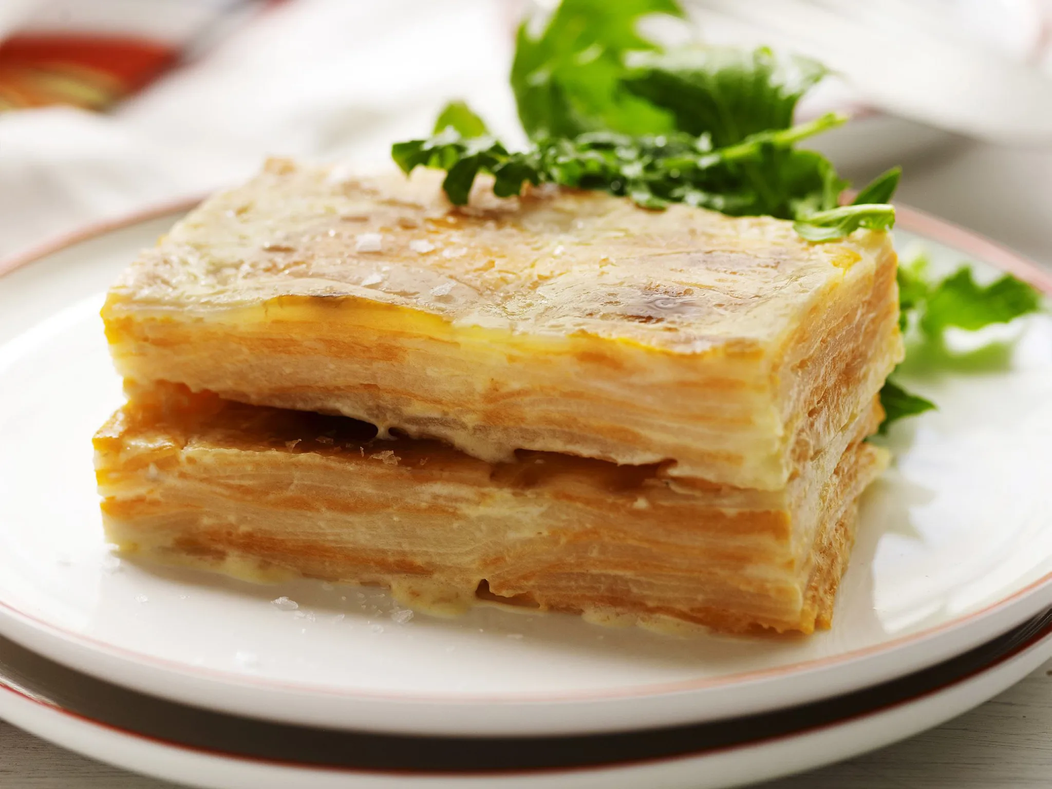 You can peel the potatoes in advance and leave them in a bowl of cold water so they don’t go brown. Once they are sliced, assemble the dish immediately. Don’t stand the sliced potatoes in cold water or you will wash away their natural starch, which thickens the sauce.