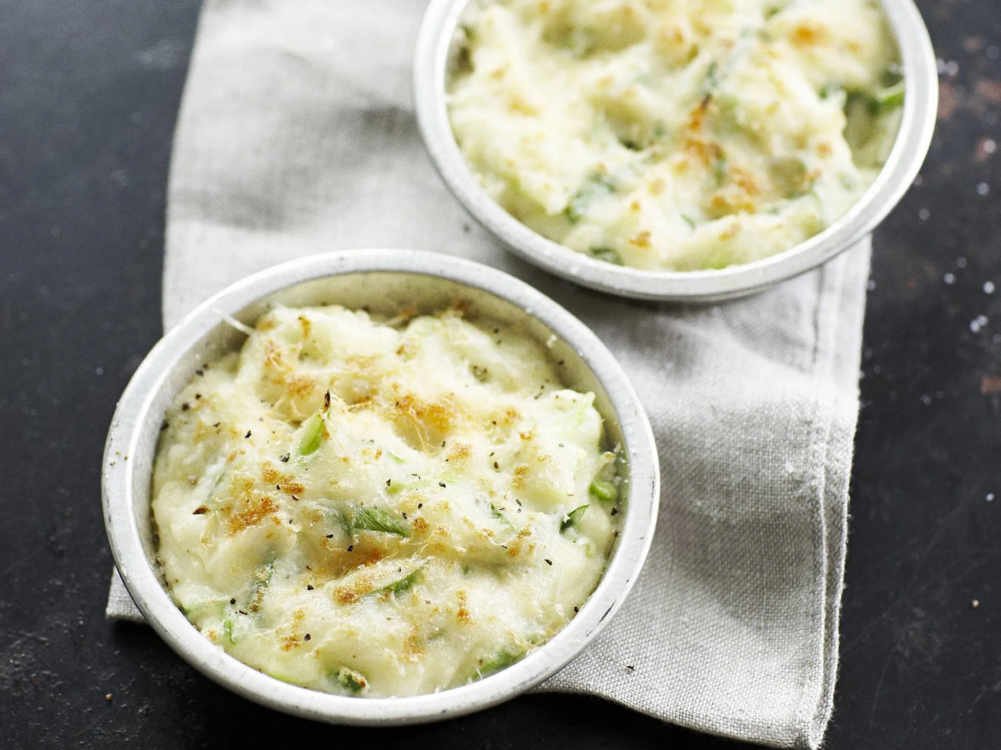 2.Increase oven temperature to 220°C (200°C fan-forced). Split potatoes in half lengthways; scoop flesh into medium bowl, discard potato skins. Mash potato with butter and onions. Divide mashed potato among dishes, smooth tops; do not pack mixture down tightly.