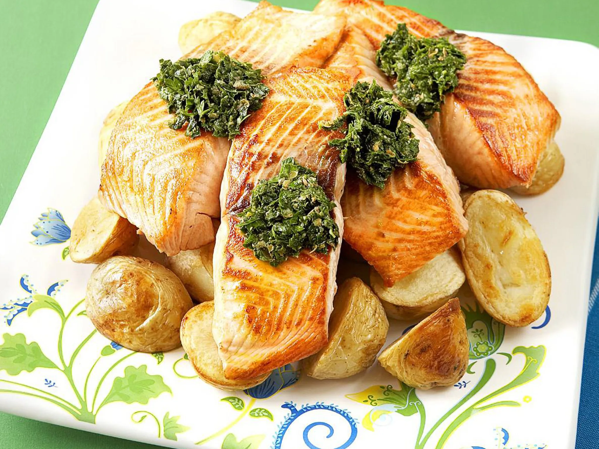 4.Grill, pan-fry or barbecue salmon until browned on both sides and cooked to your liking. Serve salmon fillets on a bed of roast chats. Top each fillet with a generous spoonful of salsa verde.