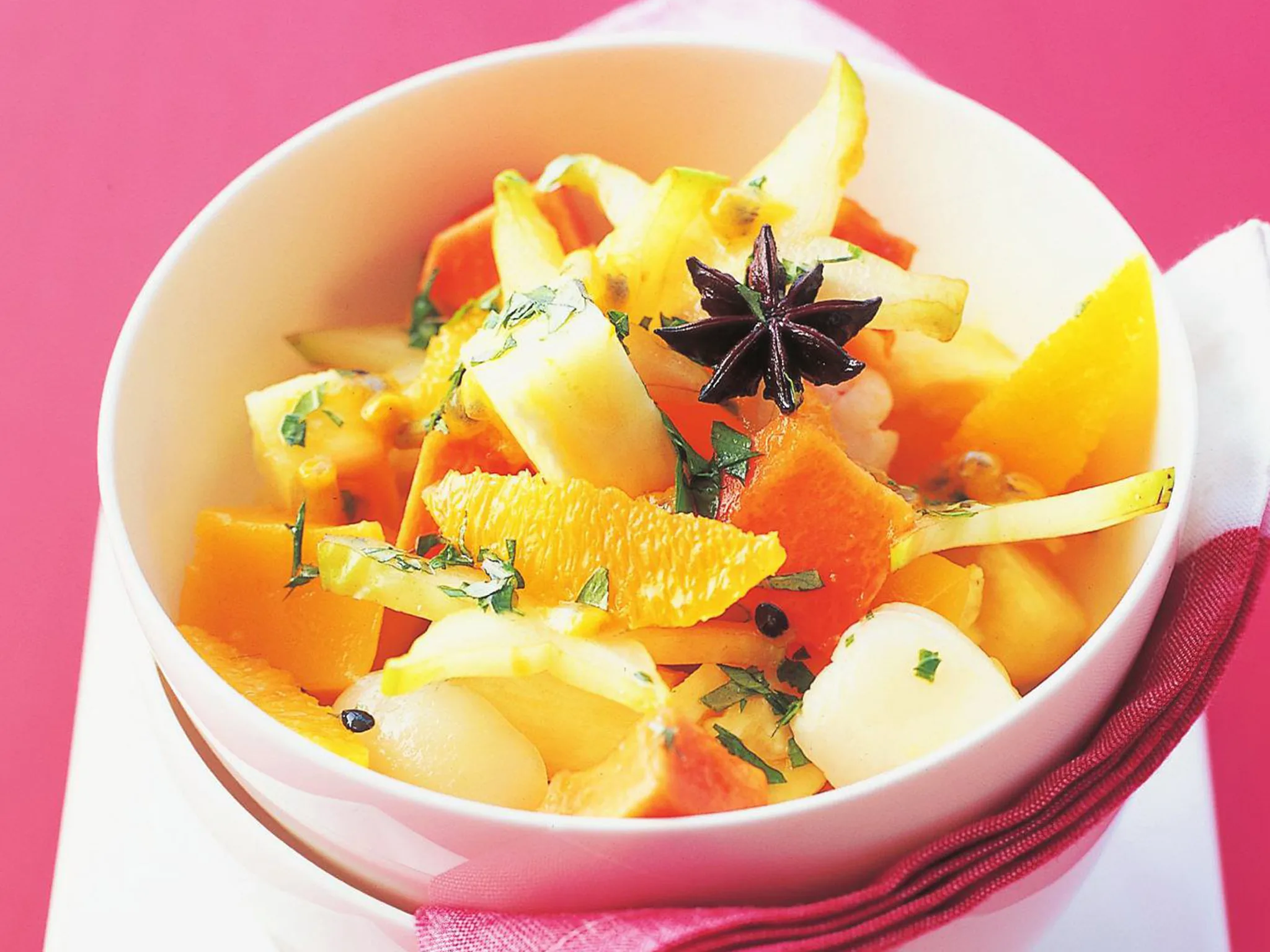 2.Split vanilla bean in half lengthways; scrape seeds into pan. Add pod, ginger and star anise; simmer, uncovered, about 10 minutes or until syrup thickens. Discard pod; cool to room temperature. Stir in rind, juice and mint.