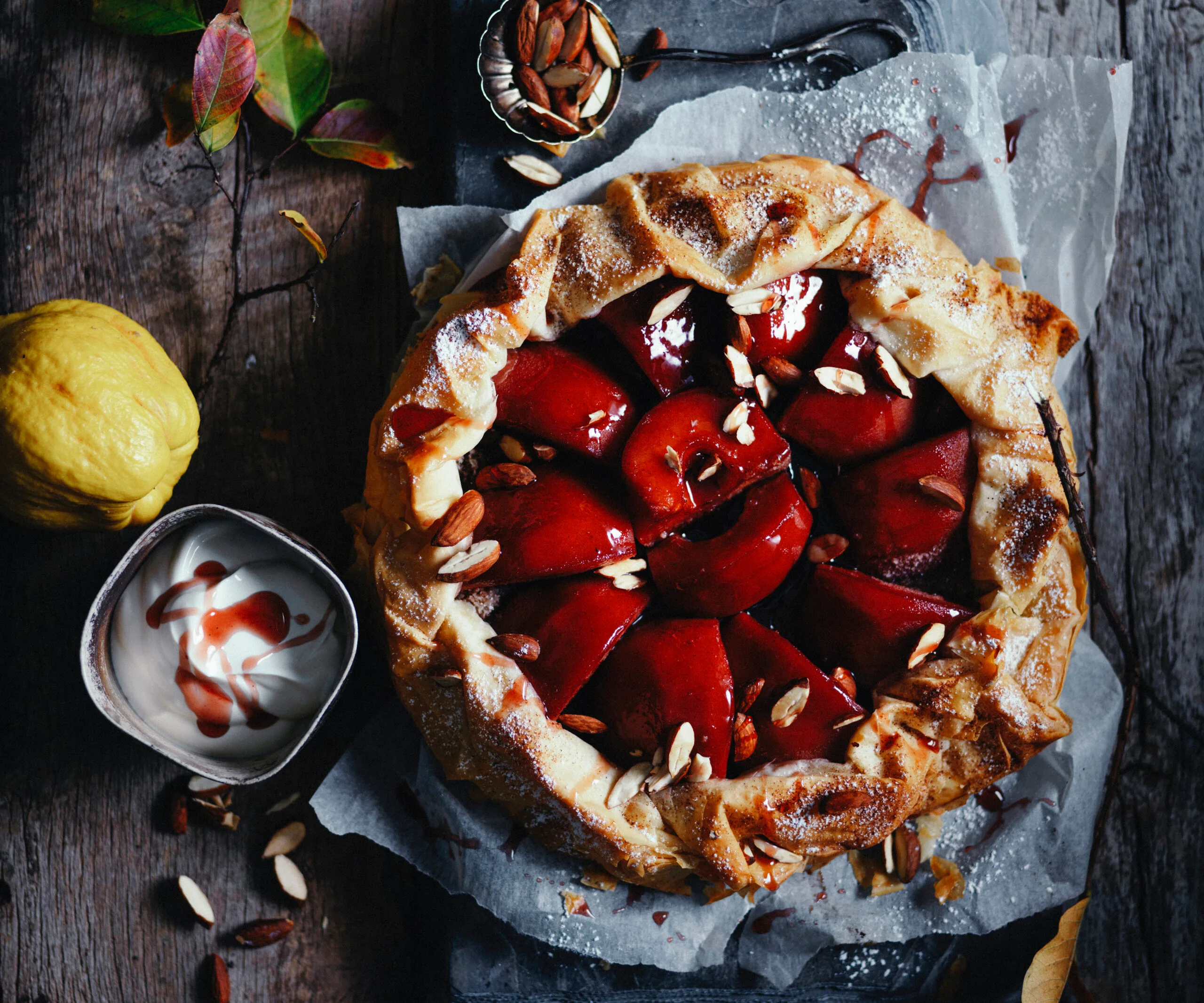 9.Bake galette for 20 minutes or until pastry is golden and crisp. Drizzle with most of the reduced syrup; sprinkle with almonds and dust with sifted icing sugar. Serve galette with yoghurt drizzled with remaining syrup.