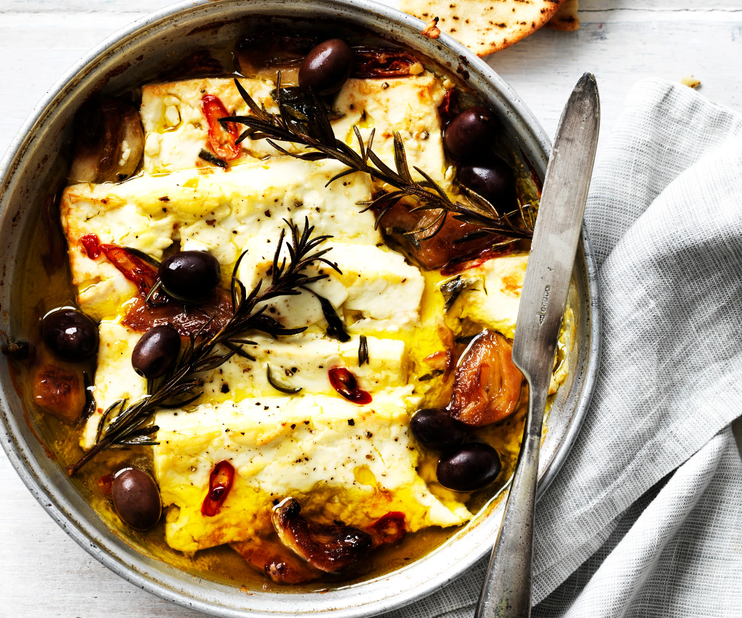 3.Increase oven to 200°C. Pat feta dry with paper towel. Cut feta into 4cm thick slices; place in an ovenproof serving dish, just large enough for feta to fit in a single layer. Pour garlic in oil and remaining oil over feta; top with herbs, olives and chilli.