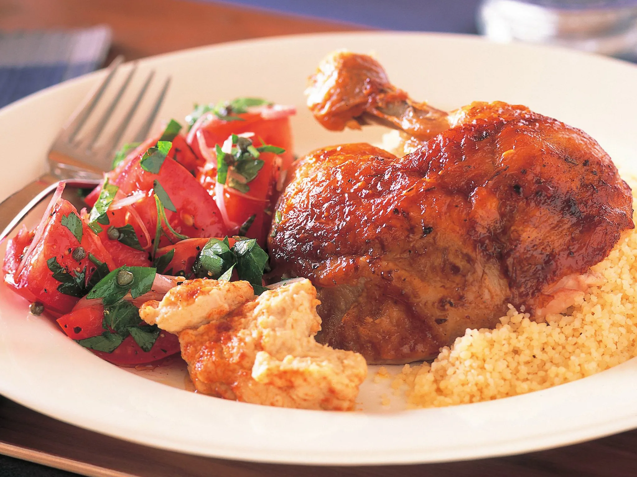 Purchase the barbecued chicken on the same day you serve it. Hummus is made from chickpeas, garlic, lemon juice and tahini (sesame seed paste) and can be purchased, ready-made, from most delicatessens and supermarkets.