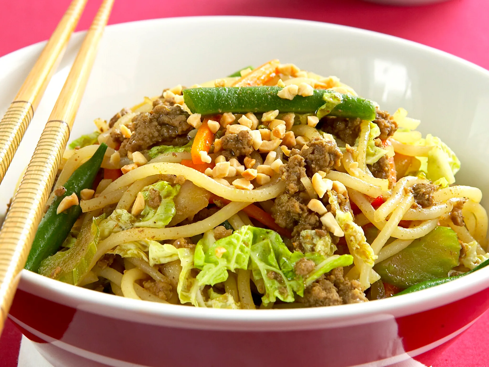 4.Toss through noodles and coriander. Stir-fry for 1 minute. Serve sprinkled with peanuts.