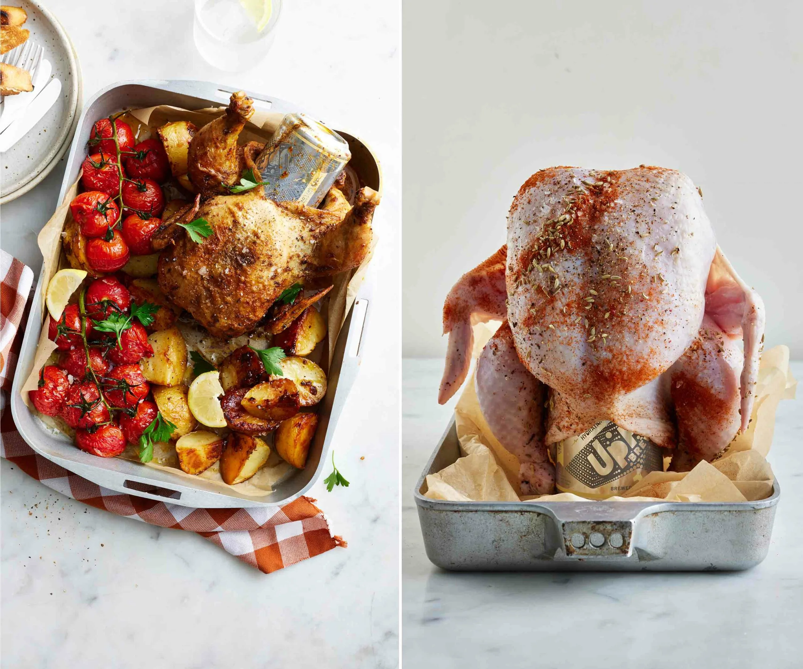 Beer can chicken: the end result (left) and as it goes into the oven (right). Use a disposable foil roasting pan if cooking on the barbecue.