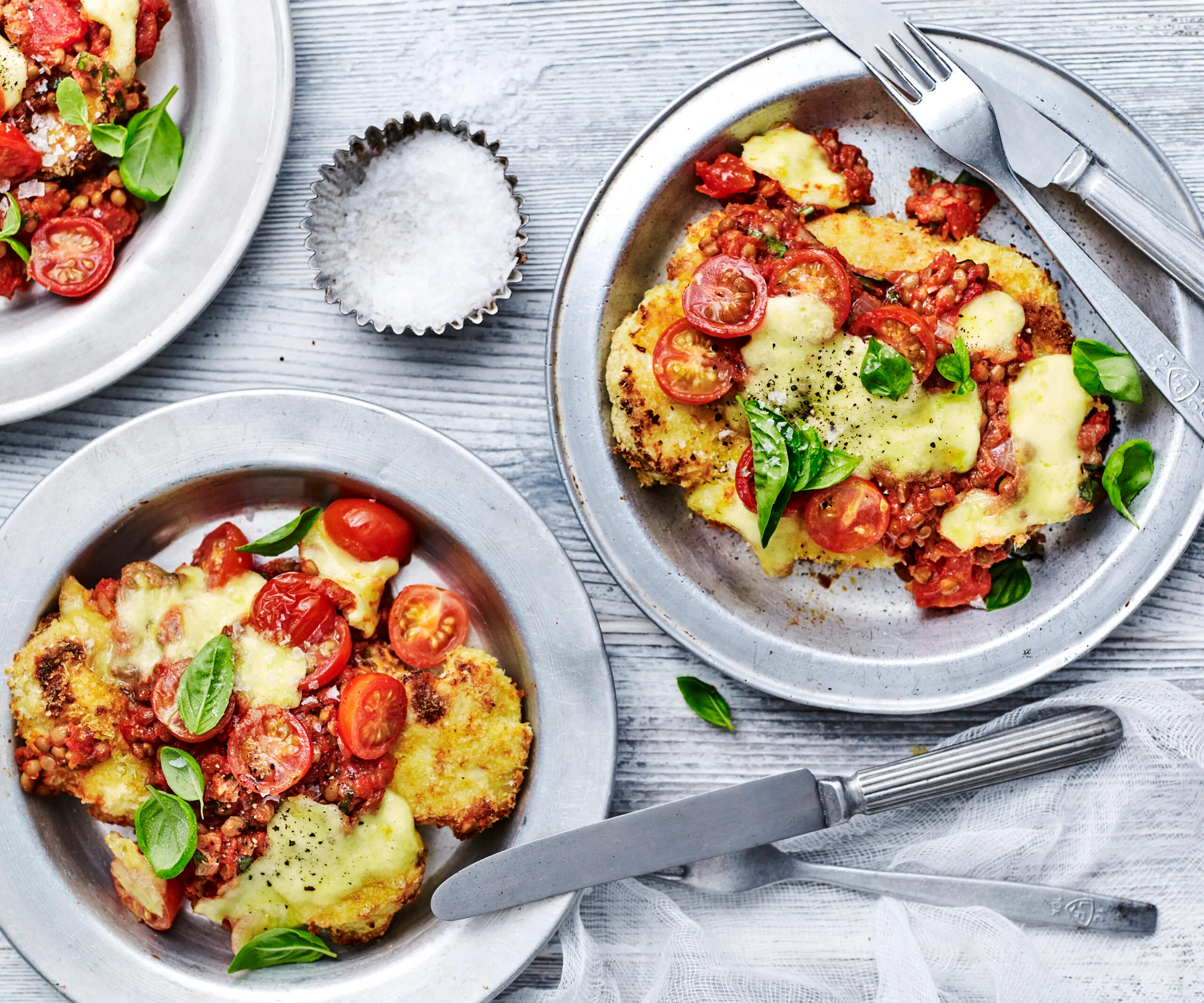 This healthy vegetarian meal uses crumbed cauliflower ‘schnitzels’ with a hearty lentil bolognese and toped with melted cheese.