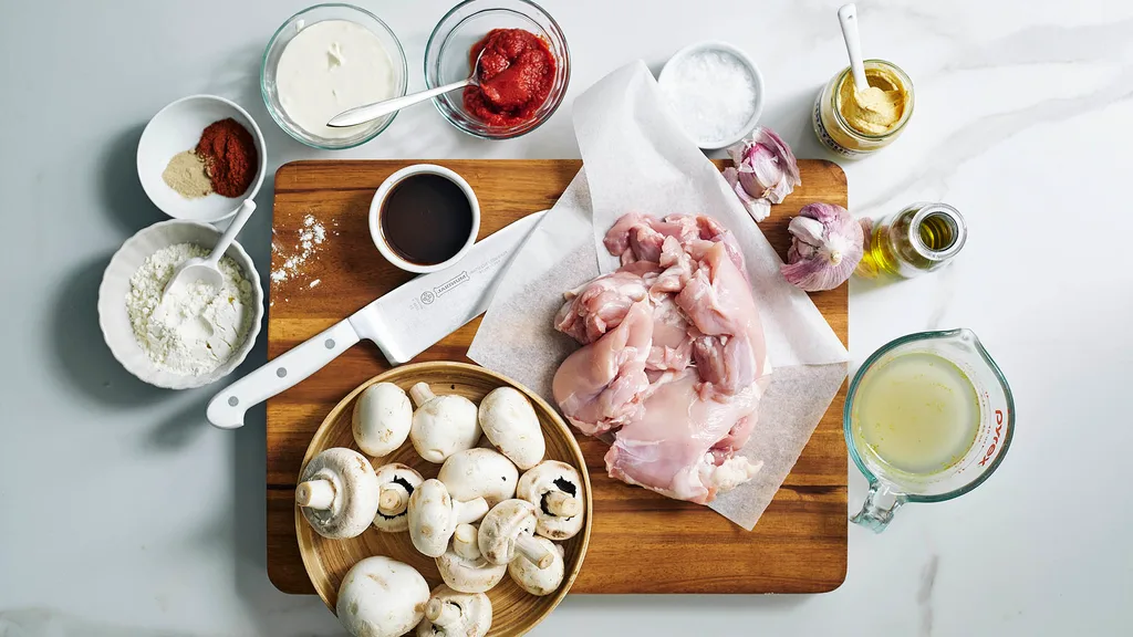 Reduce the heat to medium high. Place the last of the oil in the pan and sauté the mushrooms until they become golden. Add the garlic and saute for a further minute. Stir through the tomato paste until well combined. Add the stock, Worcestershire sauce, mustard and sour cream to the pan. Return the chicken to the pan and simmer for a few minutes until the chicken is cooked through.