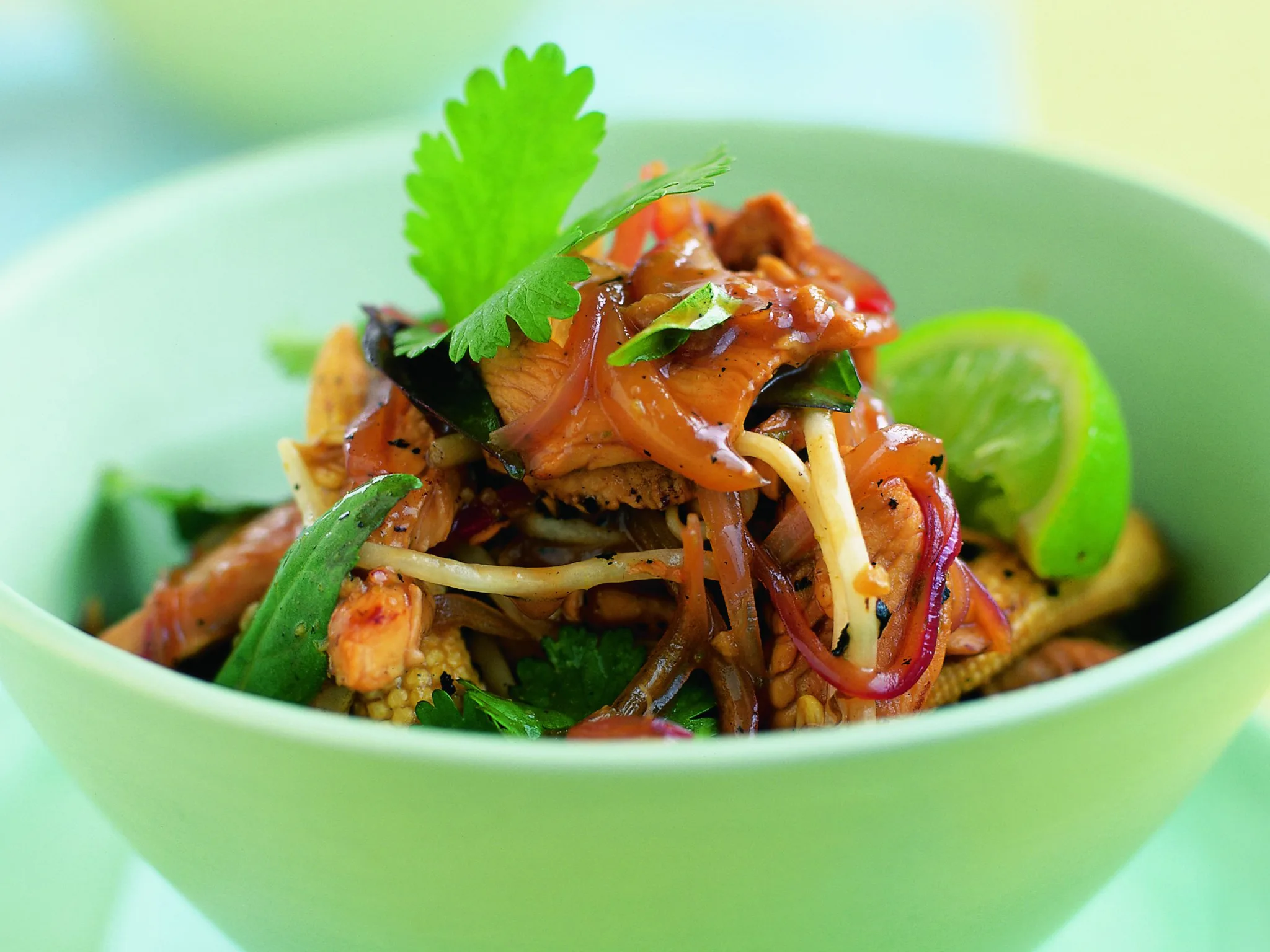4.Remove from heat, add sprouts, basil and cilantro. Toss with chicken and vegetables until combined.
