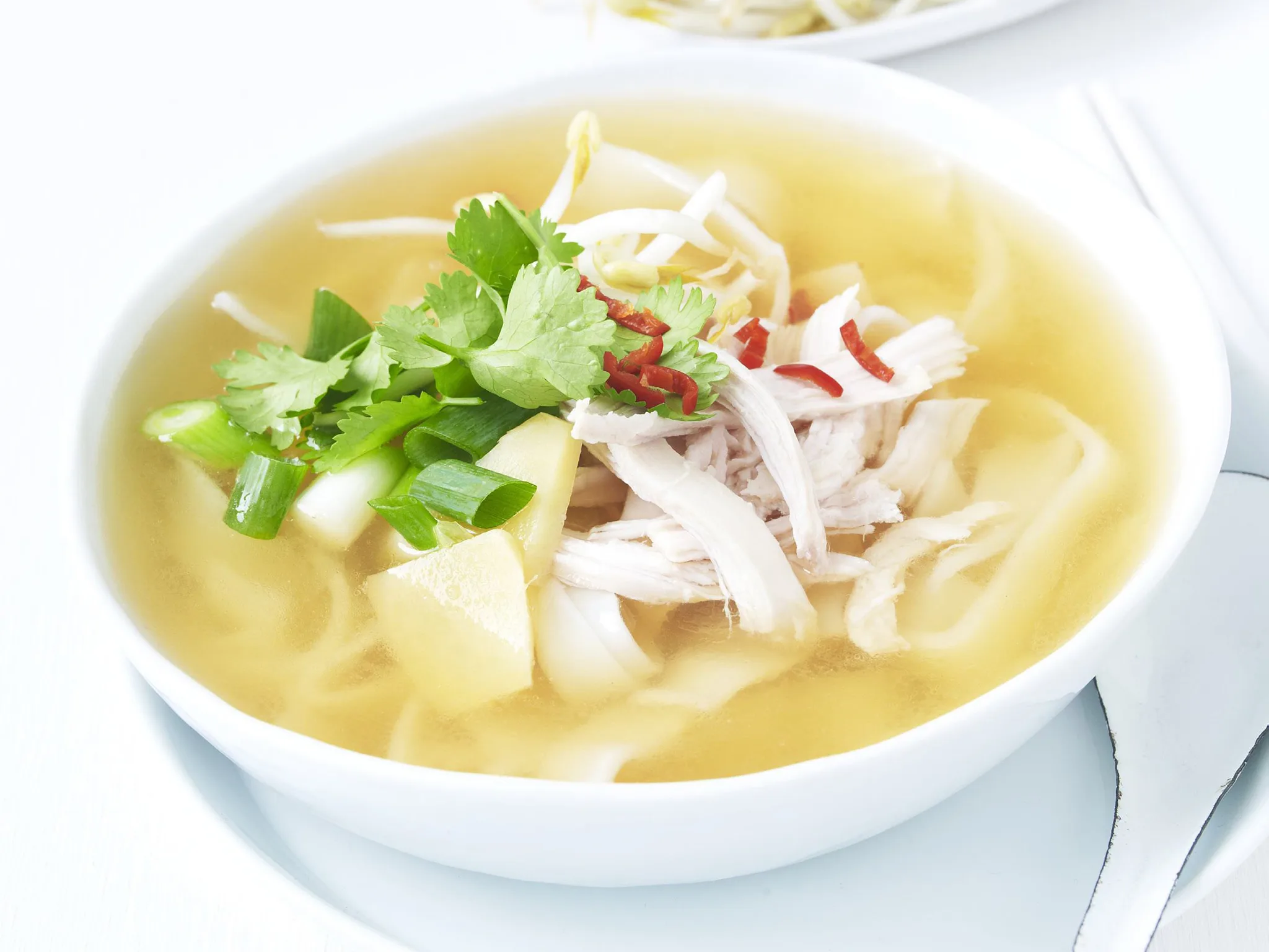 3.Add chicken and remaining ingredients to broth, stir over heat until hot.