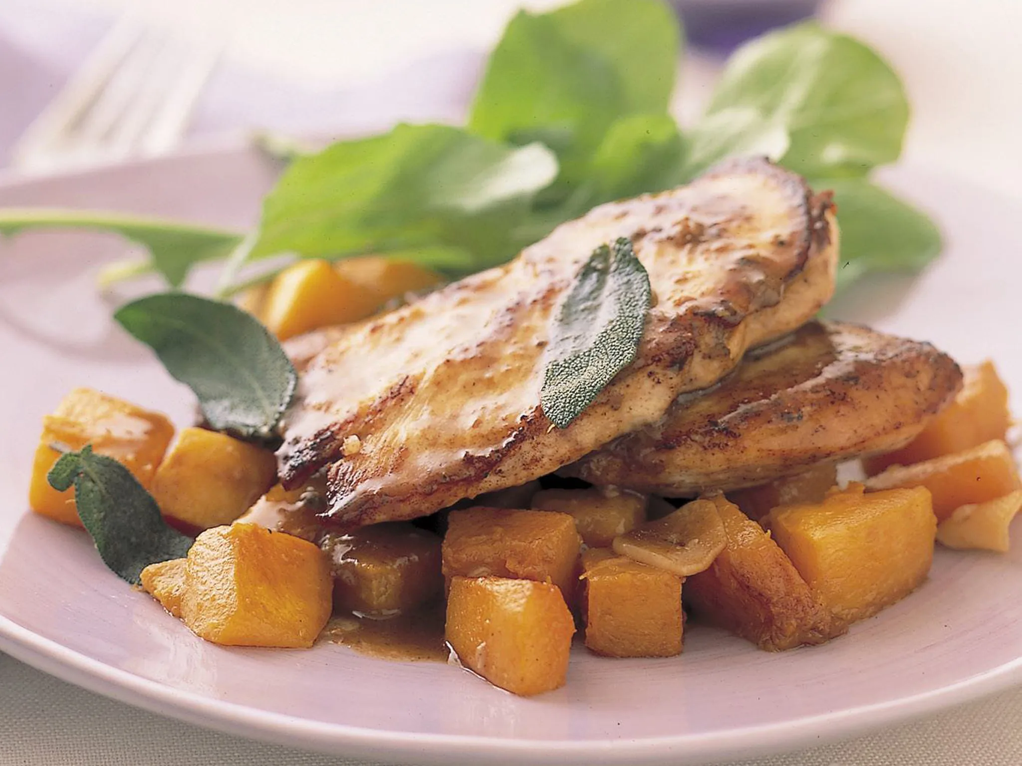 4.Serve pumpkin topped with chicken and sauce. Serve with rocket or a green salad, if desired.