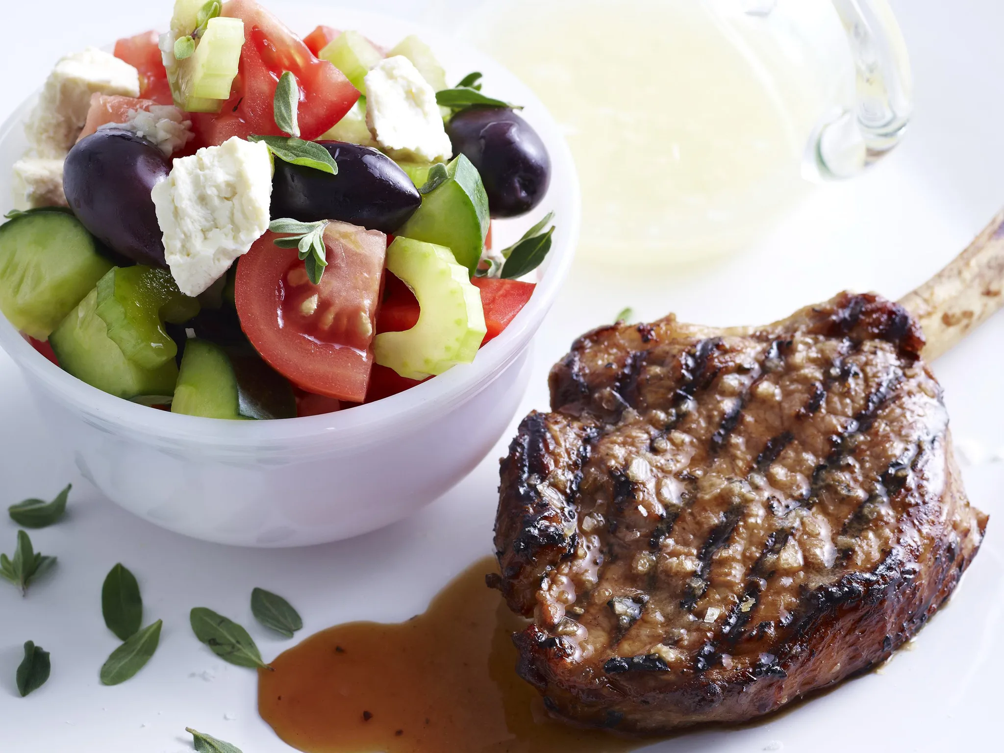 2.Meanwhile, make Greek salad. Combine olives, feta, tomatoes, capsicum, cucumber, celery and fresh marjoram leaves in a large bowl.