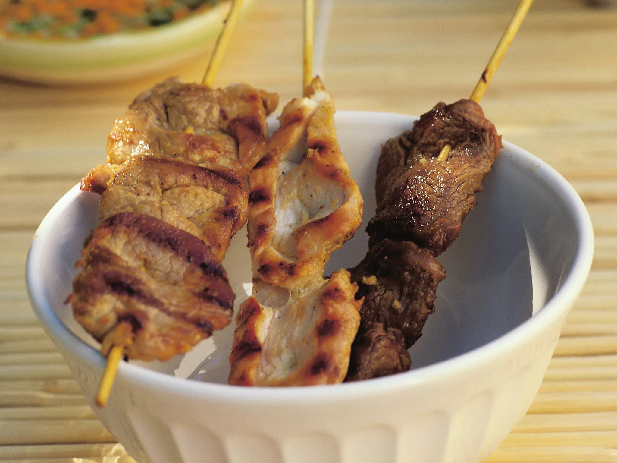 Satay skewers can be prepared a day ahead; sauces made 6 hours ahead. Store satay skewers, covered, in refrigerator; sauces, covered, at room temperature. Uncooked satay skewers suitable to freeze.