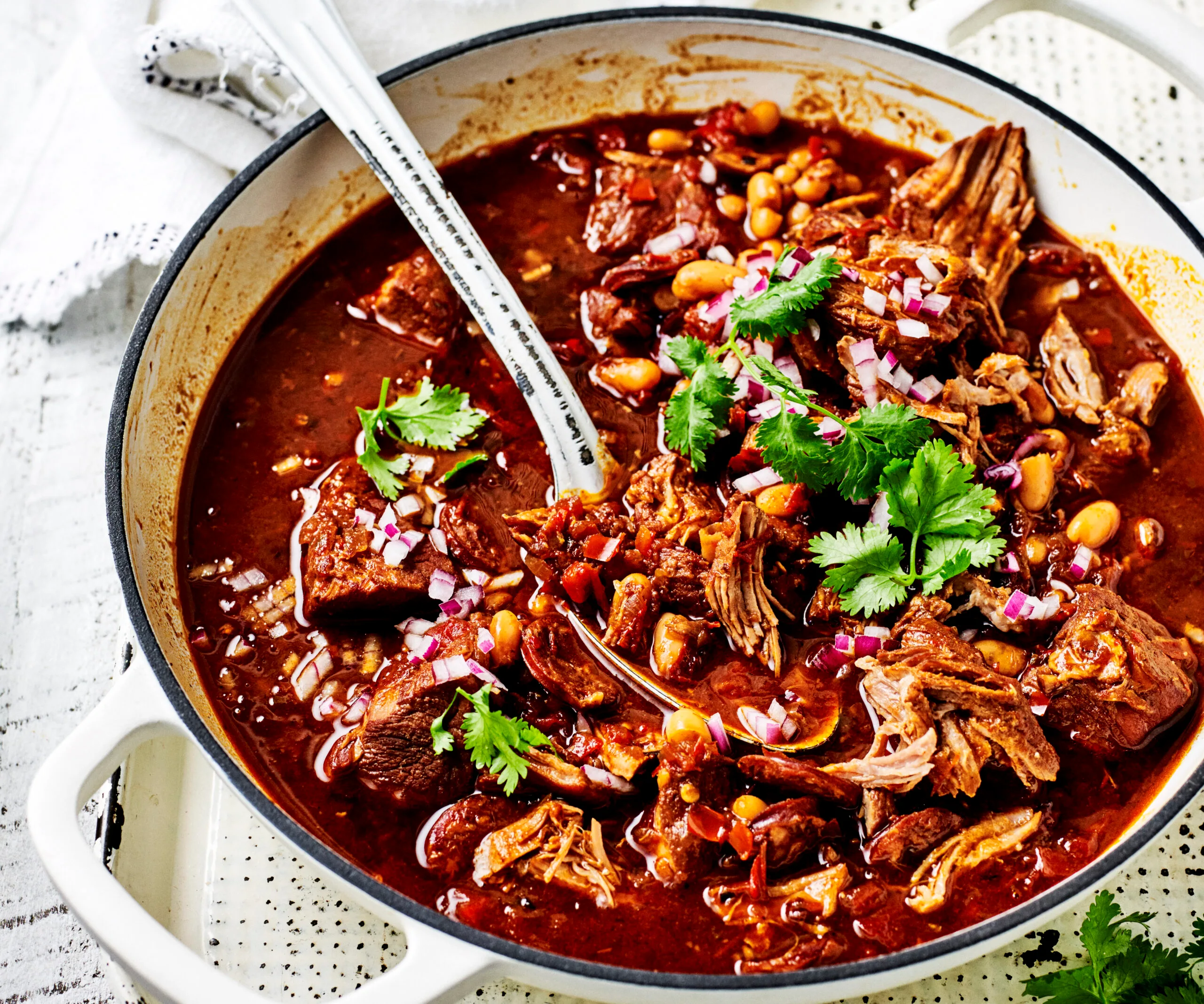 Ancho chillies are dried poblano chillies; they have a mild heat and subtle coffee flavour. Guajillo chillies are dried, large red chillies with medium heat. Both are available from spice stores, gourmet food stores and some delis, or order them online. We used a 28cm round cast iron casserole dish.