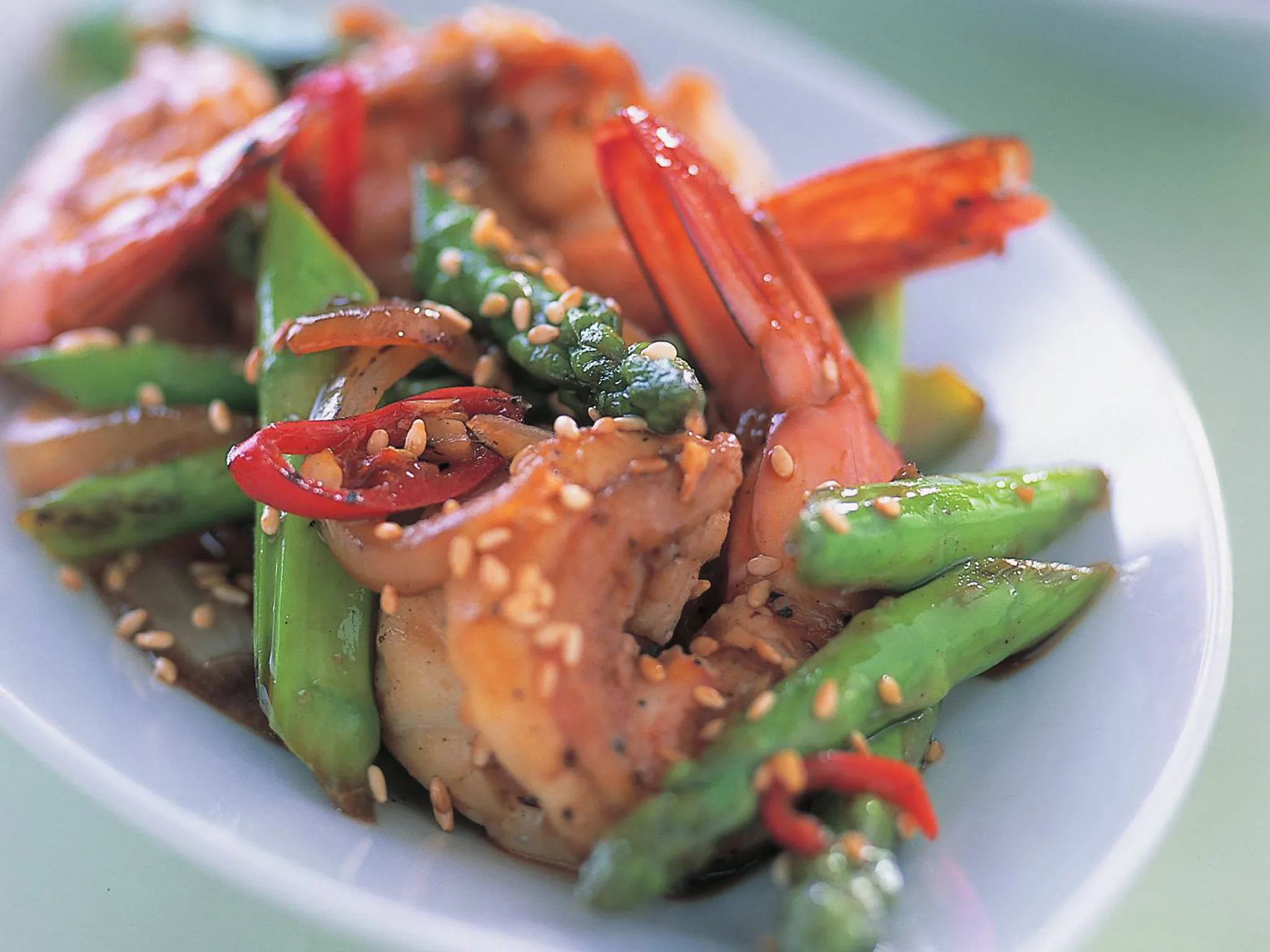 4.Heat remaining oil in wok; stir-fry prawns, in batches, until just changed in colour. Return asparagus mixture and all prawns to wok with chilli and combined remaining ingredients; stir-fry until hot.