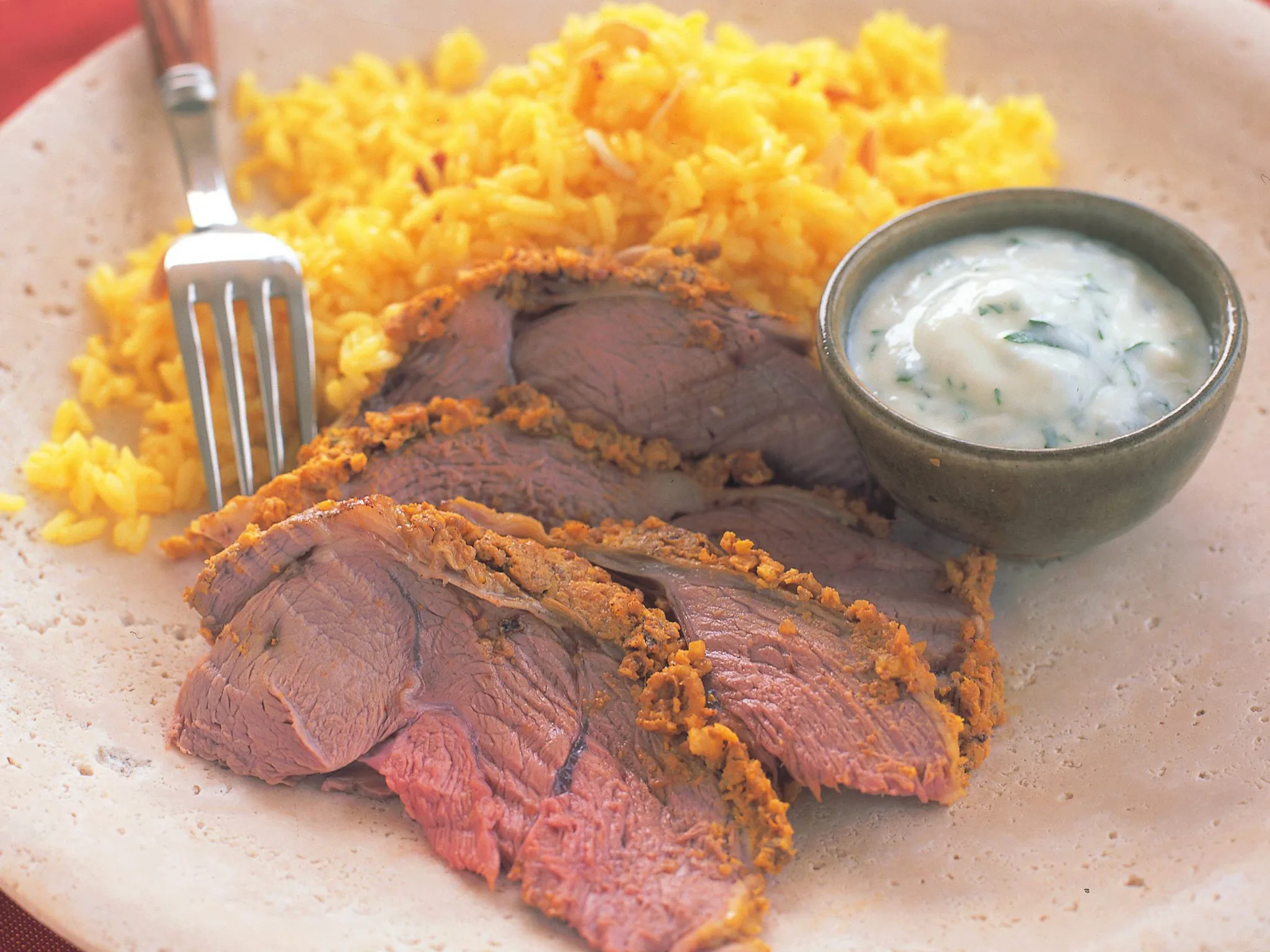 9.Cover lamb; stand 10 minutes before slicing. Serve with pilau and, if desired, yogurt with coarsely chopped fresh coriander stirred through it.