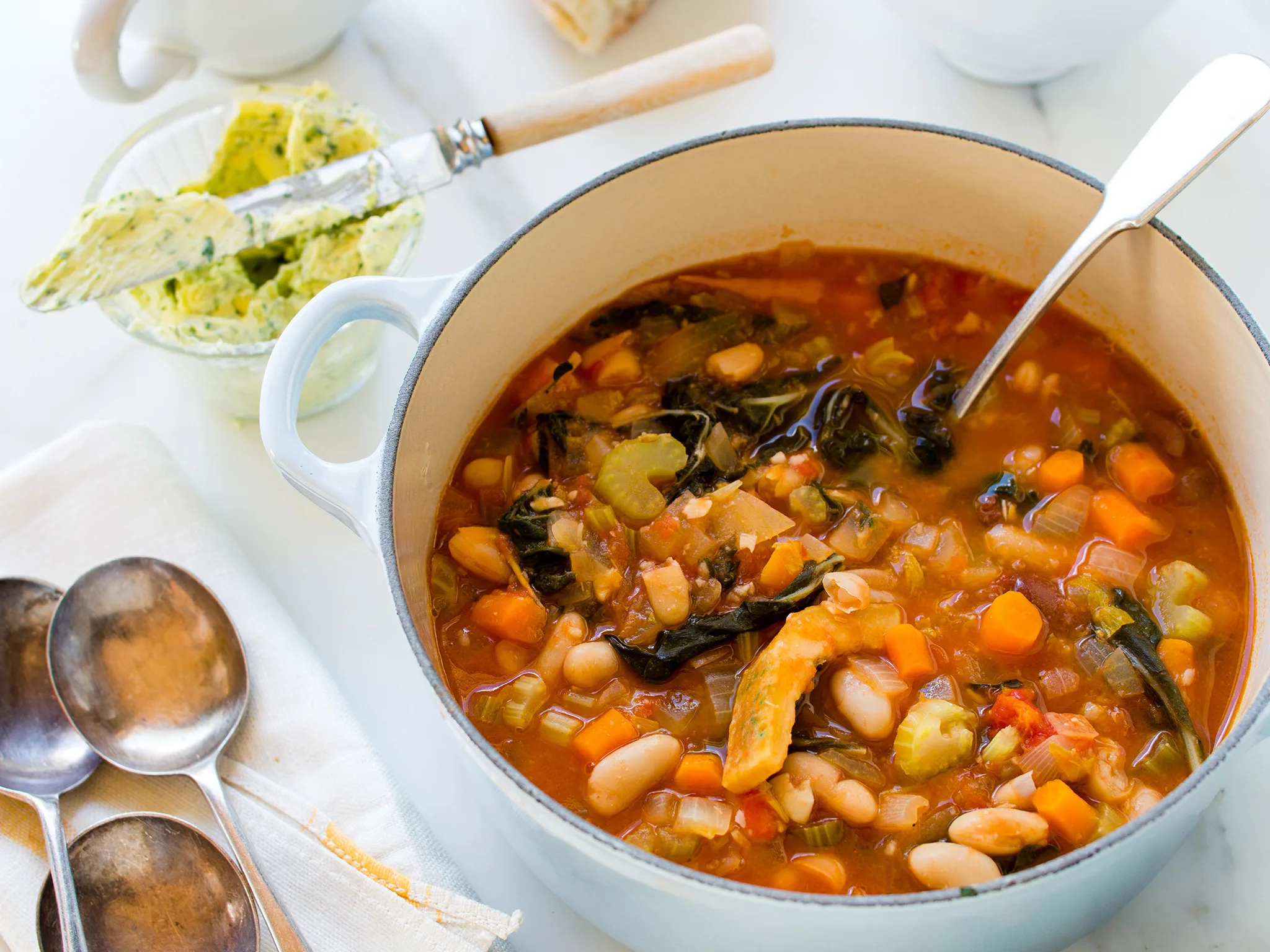 Mike’s Tips: In Italian, ribollita means “reboil”, and this soup only tastes better when you reheat it. I’ve used silverbeet, but experiment with your favourite leafy greens, such as kale, spinach or broccoli. The more chlorophyll a vegetable has, the more bitter it will taste, and the better it is in this soup. – Mike Van de Elzen