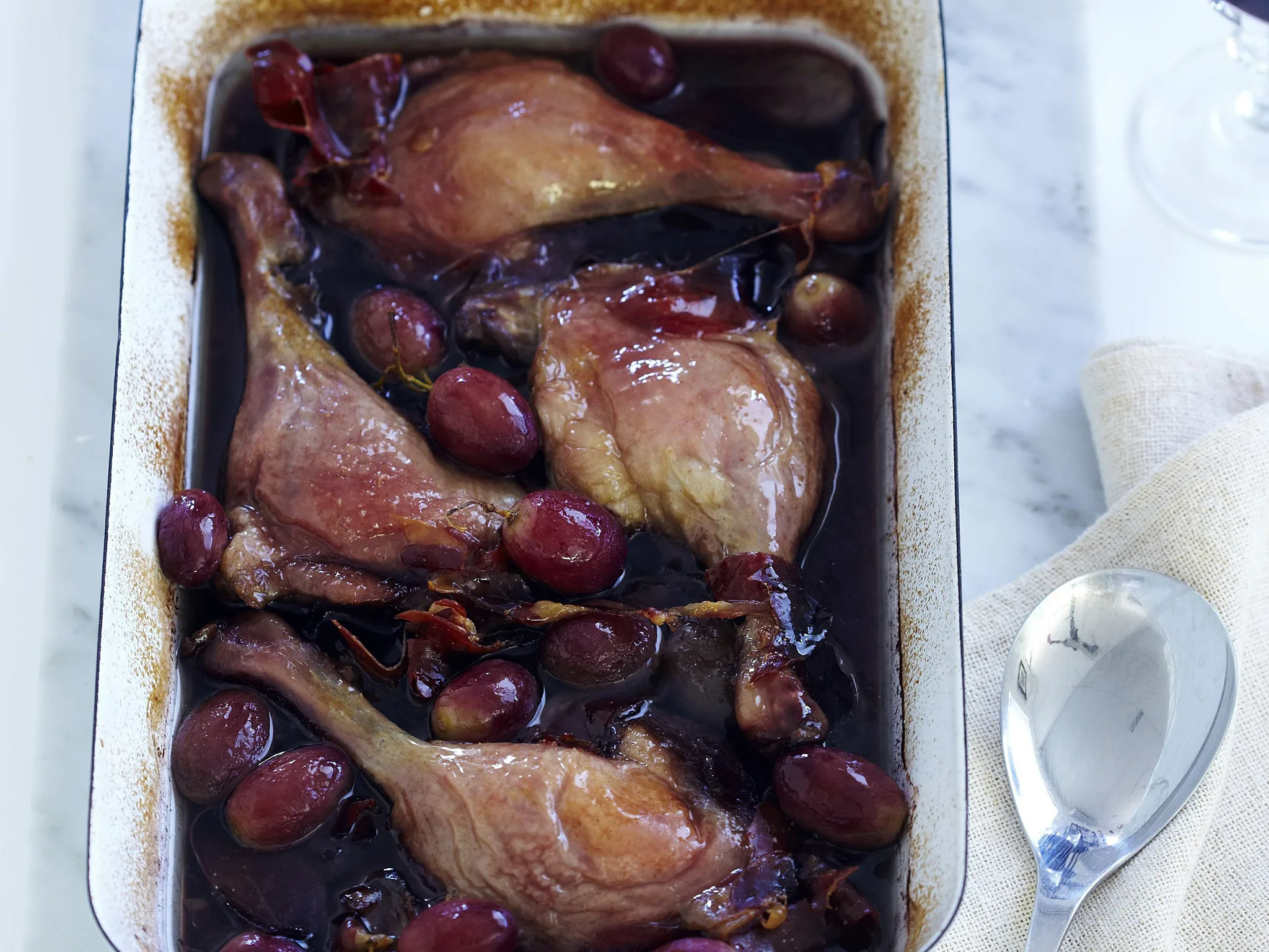 3.Reduce oven to 140°C (120°C fan-forced); roast, uncovered, 20 minutes. Add grapes to dish; roast a further 30 minutes.