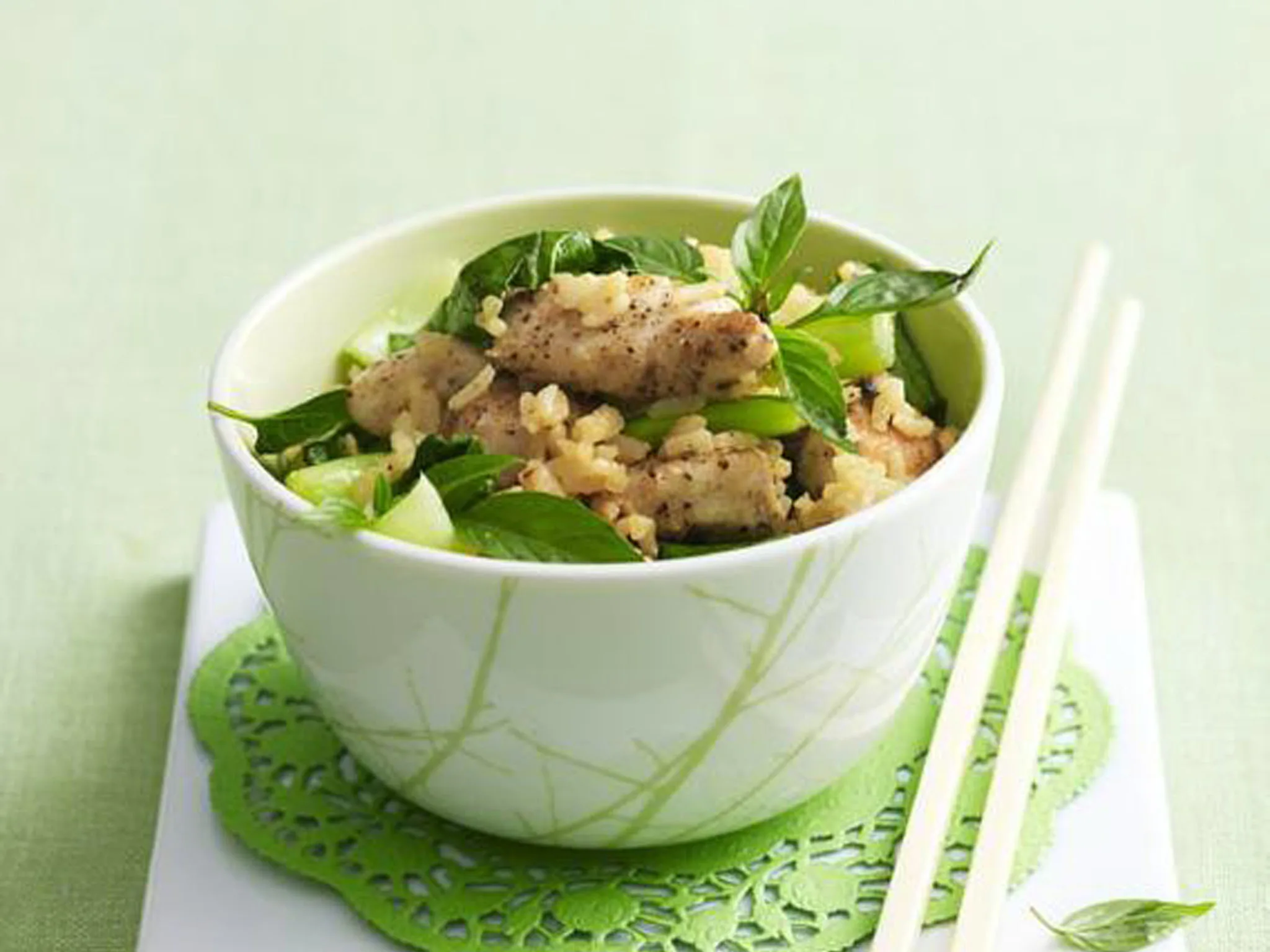 2.Heat oiled wok; stir-fry chicken until cooked. Add pak choy and miso paste; stir-fry until pak choy wilts. Add rice; stir-fry until hot, season to taste.