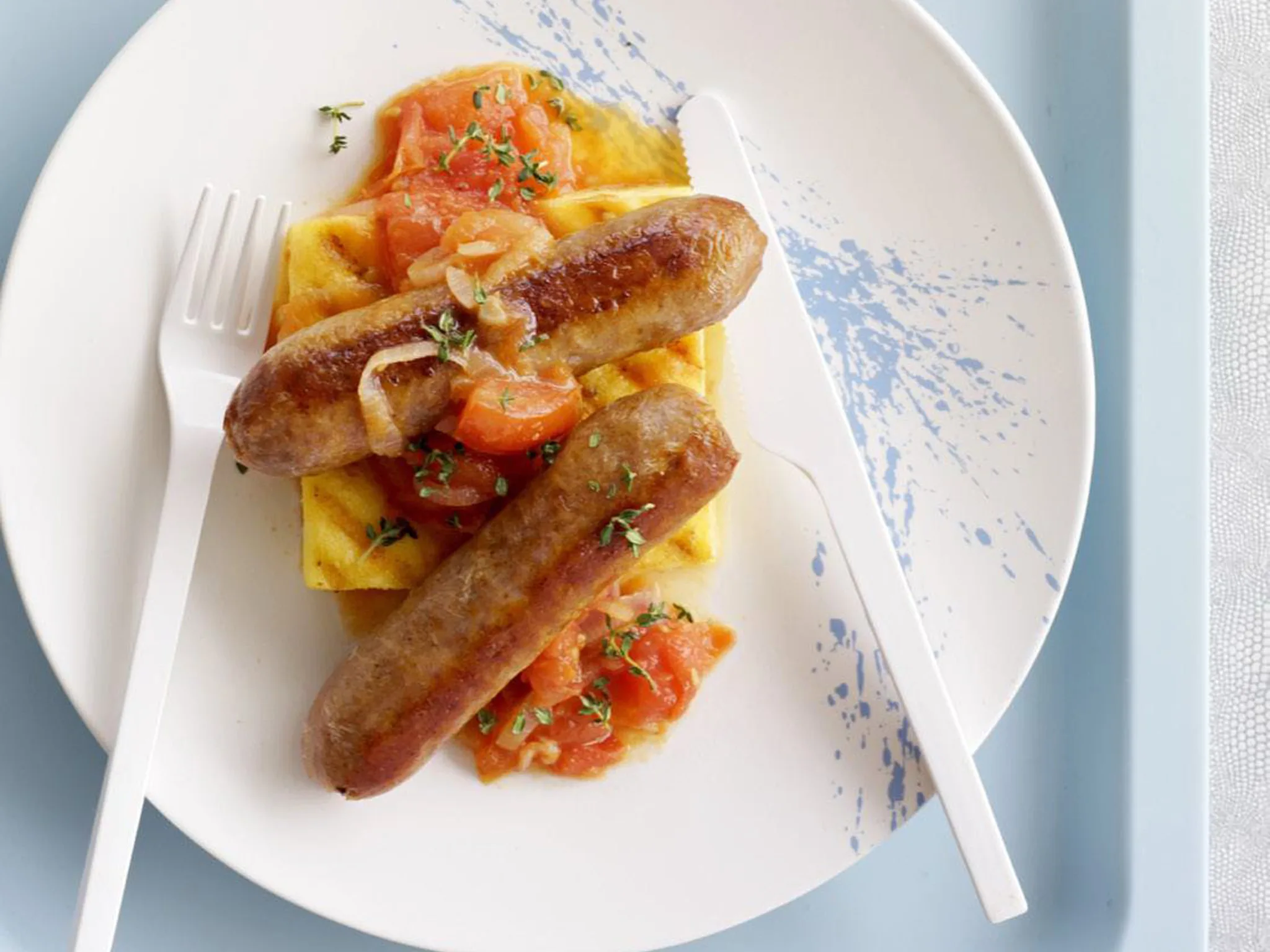 5.Serve sausages on polenta squares, topped with spicy tomato sauce.