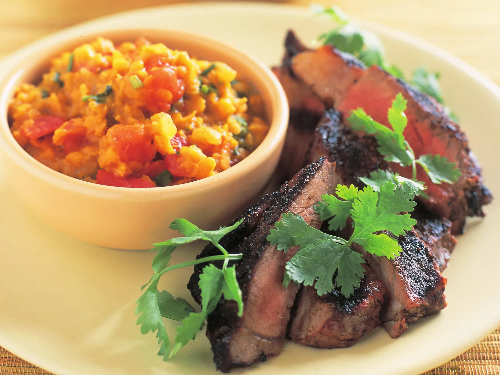 4.Serve steak with dhal, coriander leaves and lime wedges.