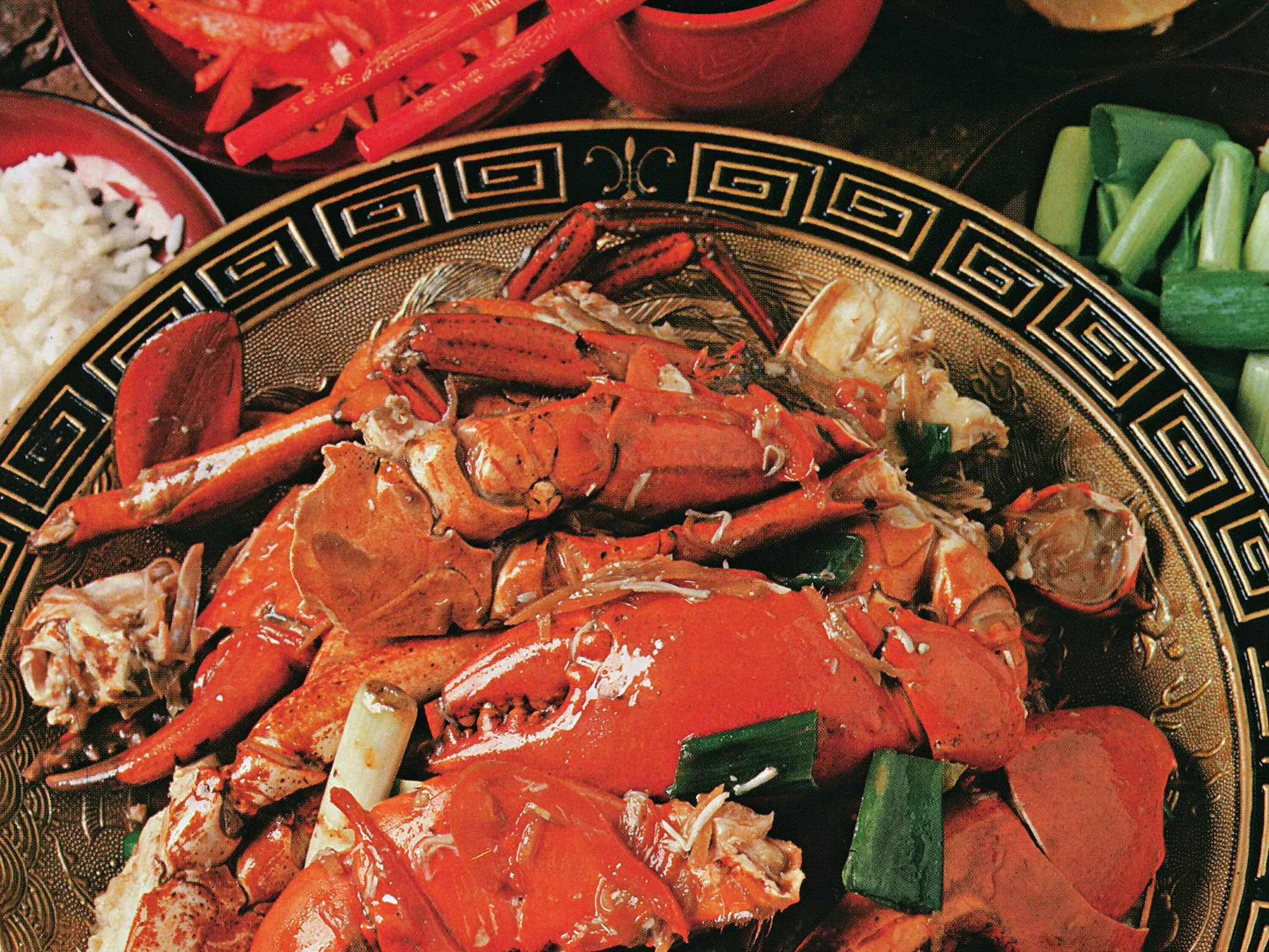 5.Combine oil and sesame oil in wok or pan, add prepared ginger, saute very gently for two minutes, add prepared crab, toss one minute. Add red pepper, water, sherry, soy sauce, crumbled stock cube and sugar, bring to boil, reduce heat, simmer covered for four minutes, remove lid. Add combined extra water and cornflour, toss for two minutes or until sauce is boiling and coats crab well. Add shallots, toss for one minute.