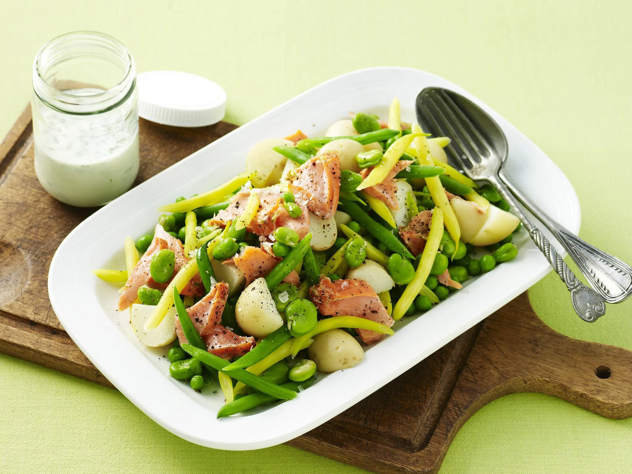 4.Combine fish with vegetables on a serving platter, drizzle over buttermilk dressing.