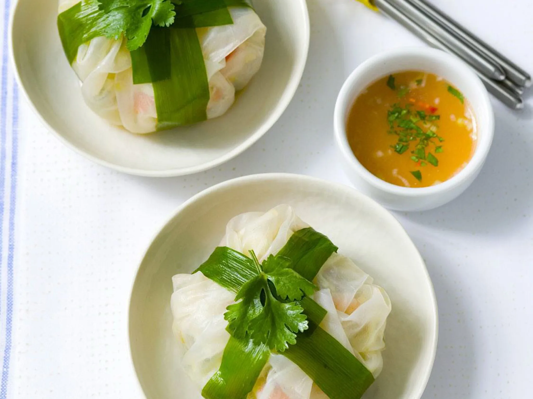 7.Carefully remove rice paper parcels from pan; serve with reserved dressing, sprinkle with fresh coriander leaves.
