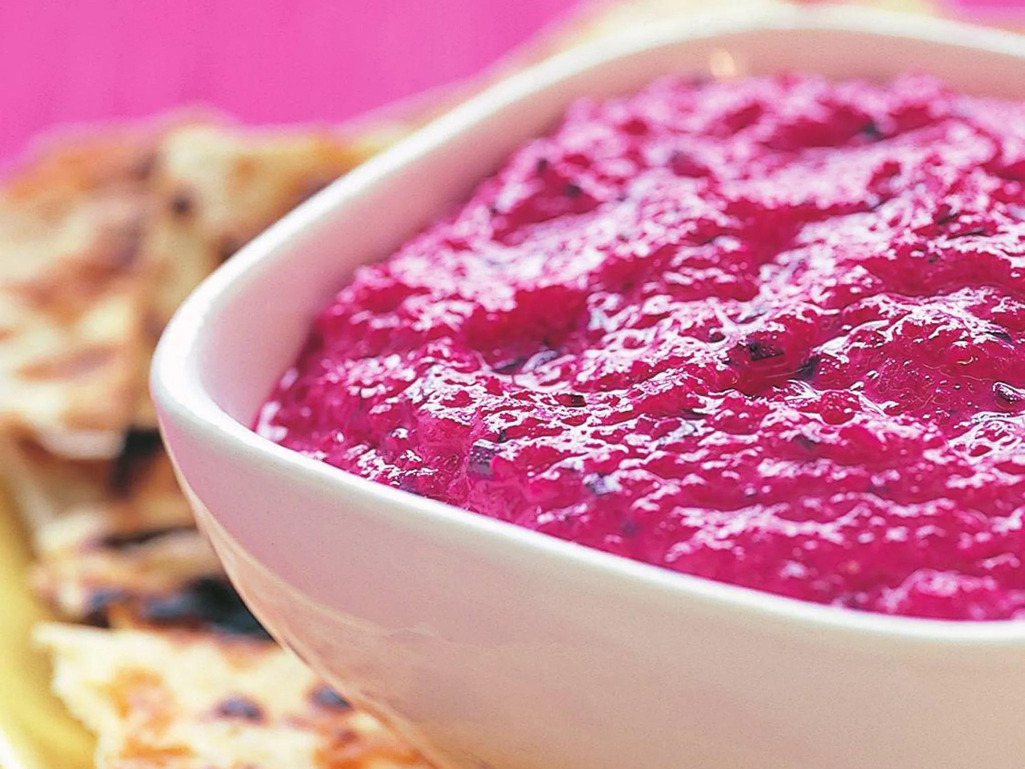 2.Peel beetroot; chop coarsely. Place beetroot in food processor with yoghurt, cheese, garlic and juice; blend until combined.