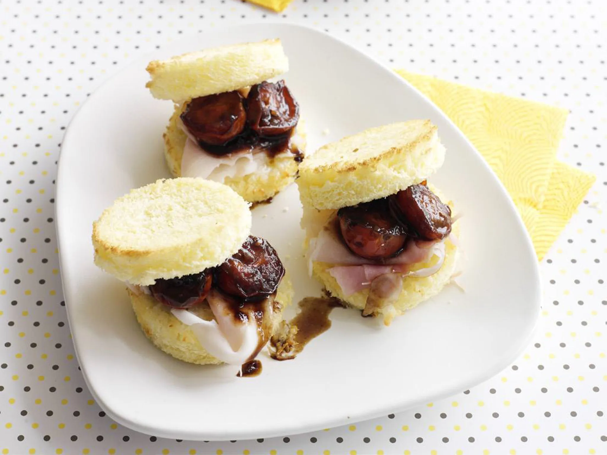 4.Top cheese toasts with ham; top with caramelised tomatoes then remaining toasts. Serve warm.