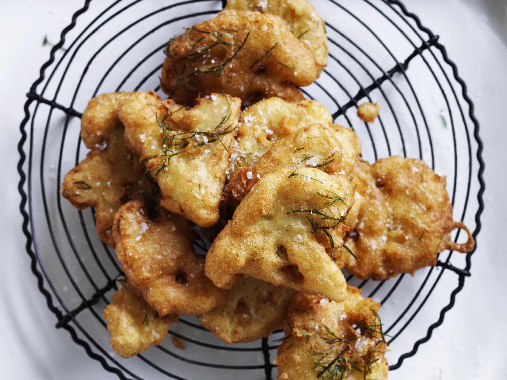 3.Fill a large saucepan or deep fryer one-third full with oil, heat to 180°C (160°C fan forced) (or until a cube of bread turns golden in 10 seconds). Dip cauliflower, piece by piece, in batter, shaking off excess. Fry, in batches, for 2 minutes, turning halfway through cooking, or until golden in colour. Drain fritters on paper towel.