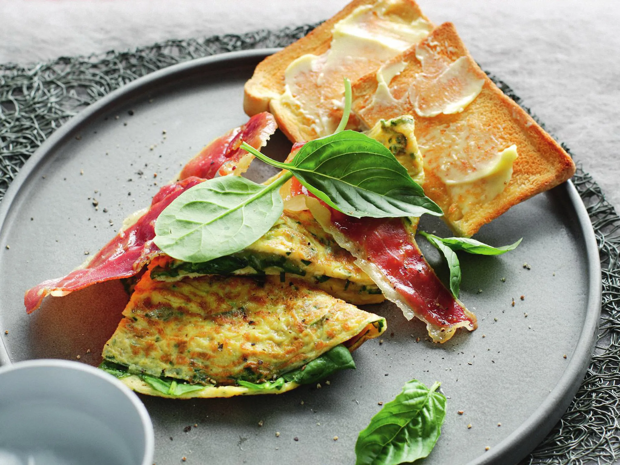 5.Fold omelette in half and slide onto a plate. Top with crispy prosciutto and basil. Serve with toast. Repeat with remaining egg mixture and filling.