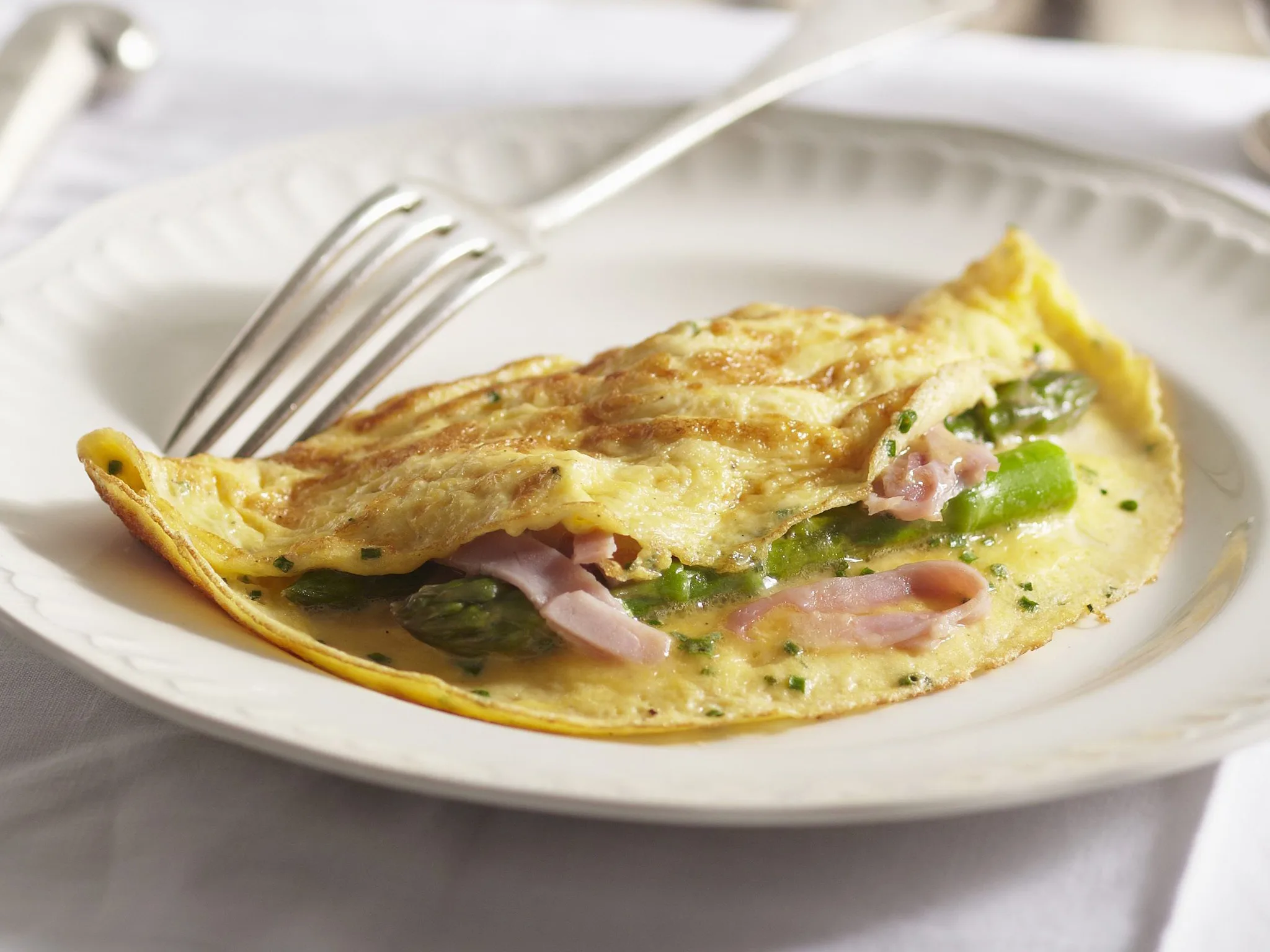 3.Heat a quarter of the butter and 1 tsp of the oil in a small frying pan over medium-high heat. When the butter is just bubbling, add a quarter of the egg mixture; tilt pan to cover base with egg mixture. Cook over medium heat until omelette is just set. Place a quarter of both the asparagus and ham on one side of the omelette. Use a spatula to lift and fold the omelette in half over asparagus and ham; cook a further 30 seconds. Carefully slide omelette onto a serving plate. Wipe out the pan.