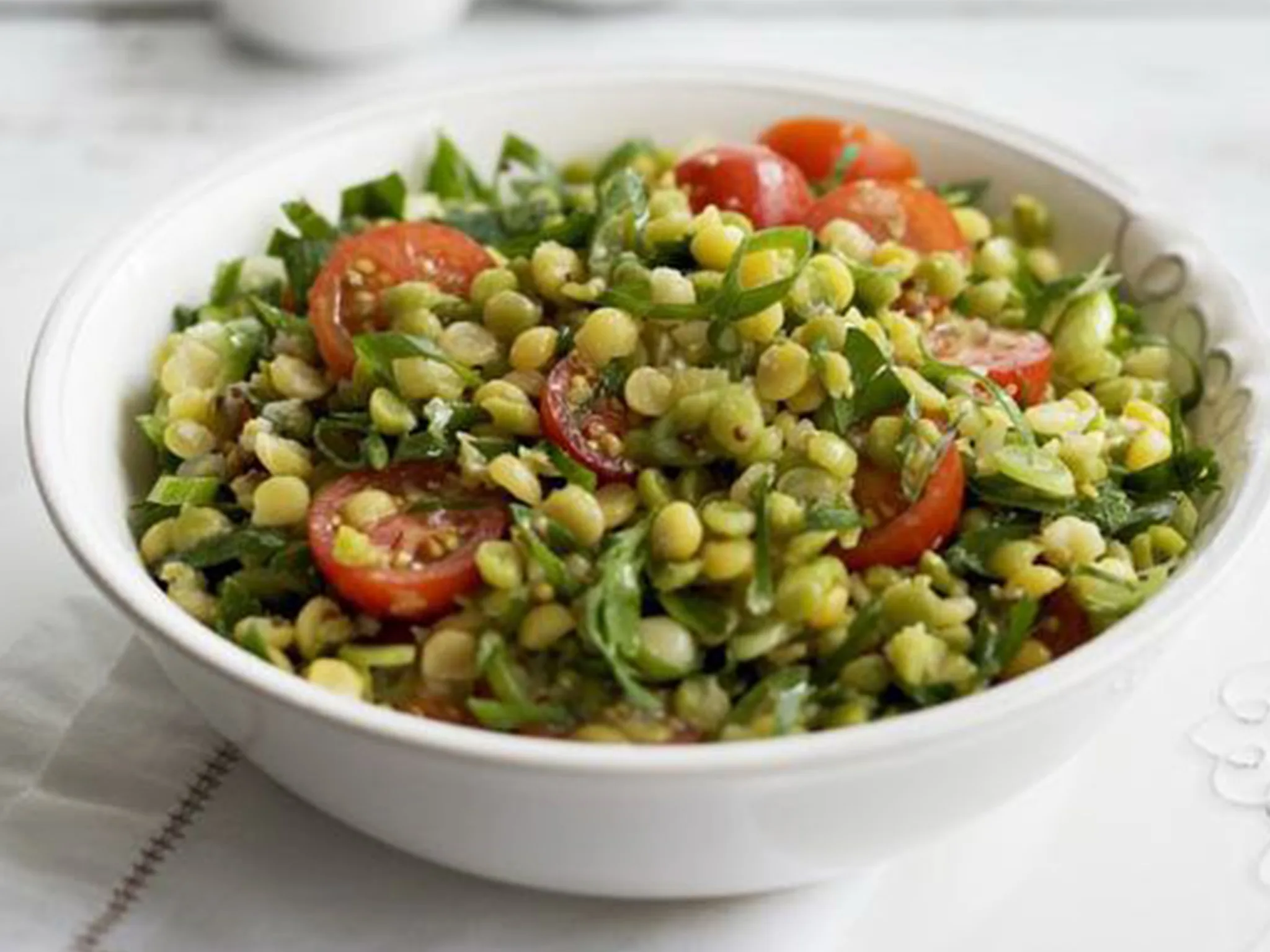 4.Place split peas in large bowl with remaining ingredients and dressing; mix gently.