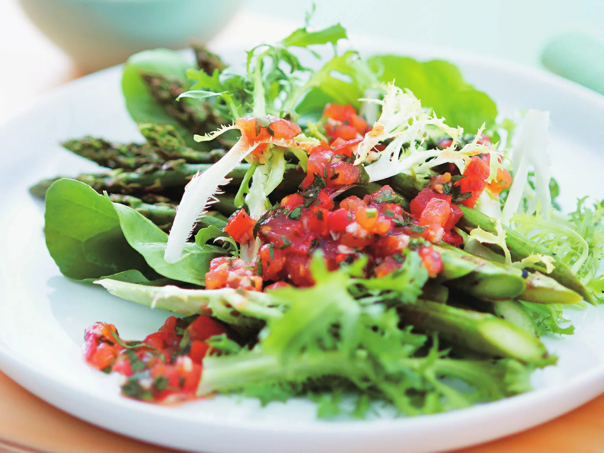 3.Place endive and rocket on serving plates; top with asparagus and tomato dressing.