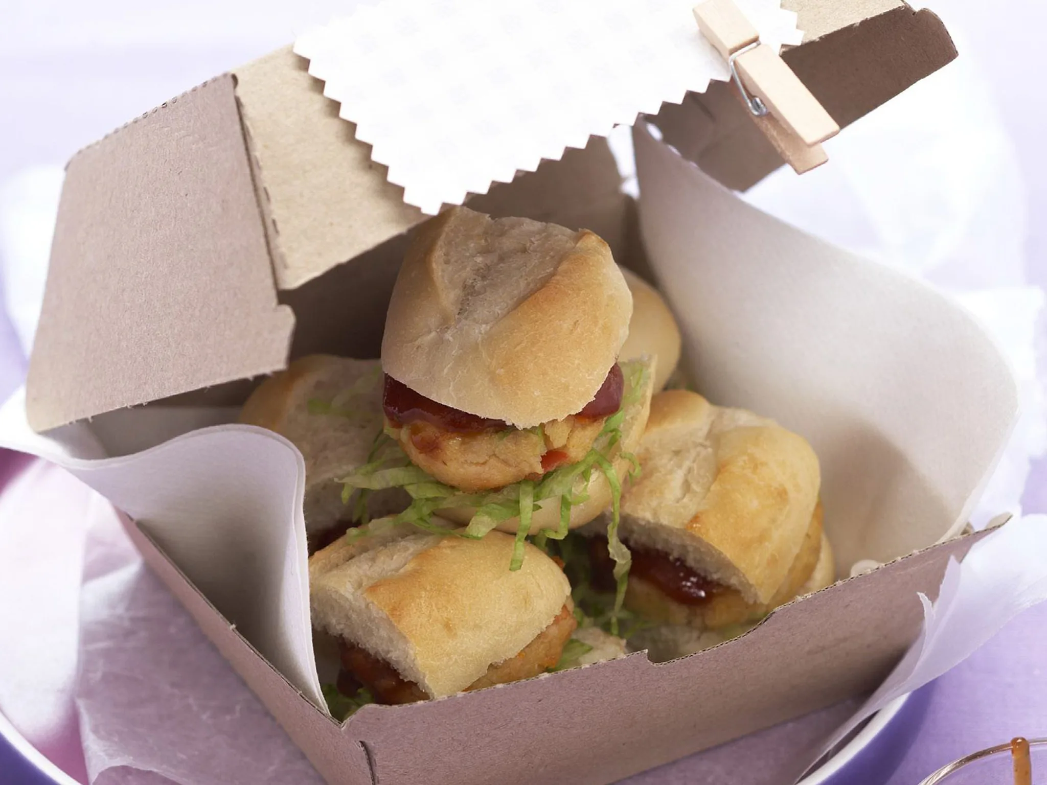 5.Split rolls in half horizontally, cut each roll in half crossways. You will have 24 mini burger buns. Divide patties, lettuce and barbecue sauce between buns.
