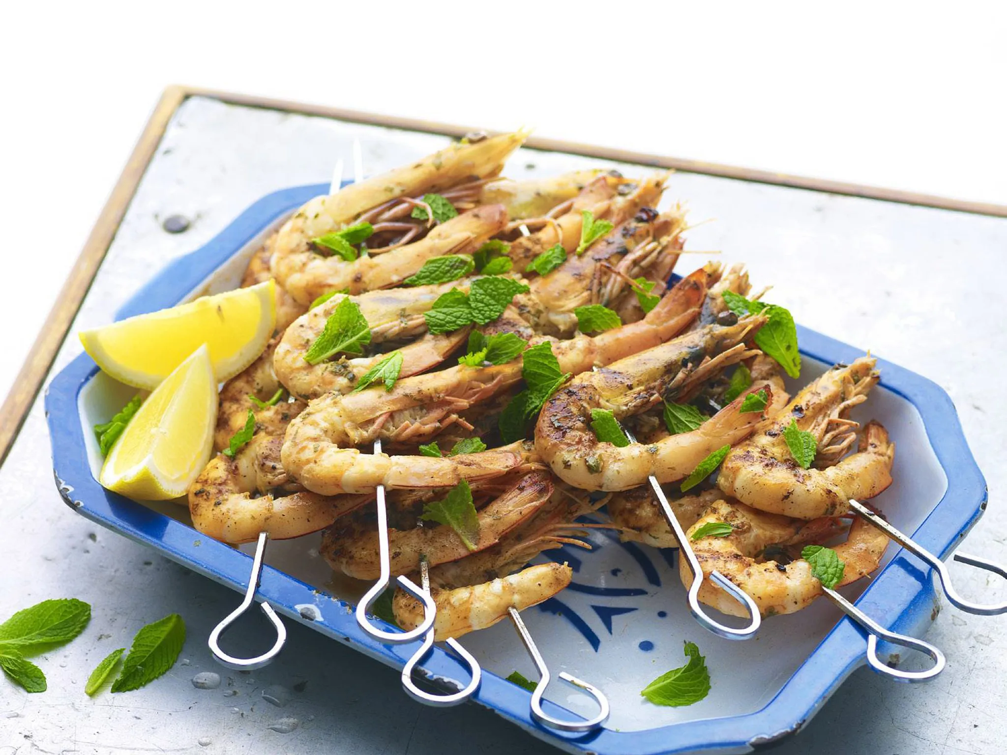 1.Shell and devein prawns, leaving heads and tails intact. Combine prawns, juice, oil, garlic and mint in large bowl, season. Cover; refrigerate 30 minutes.