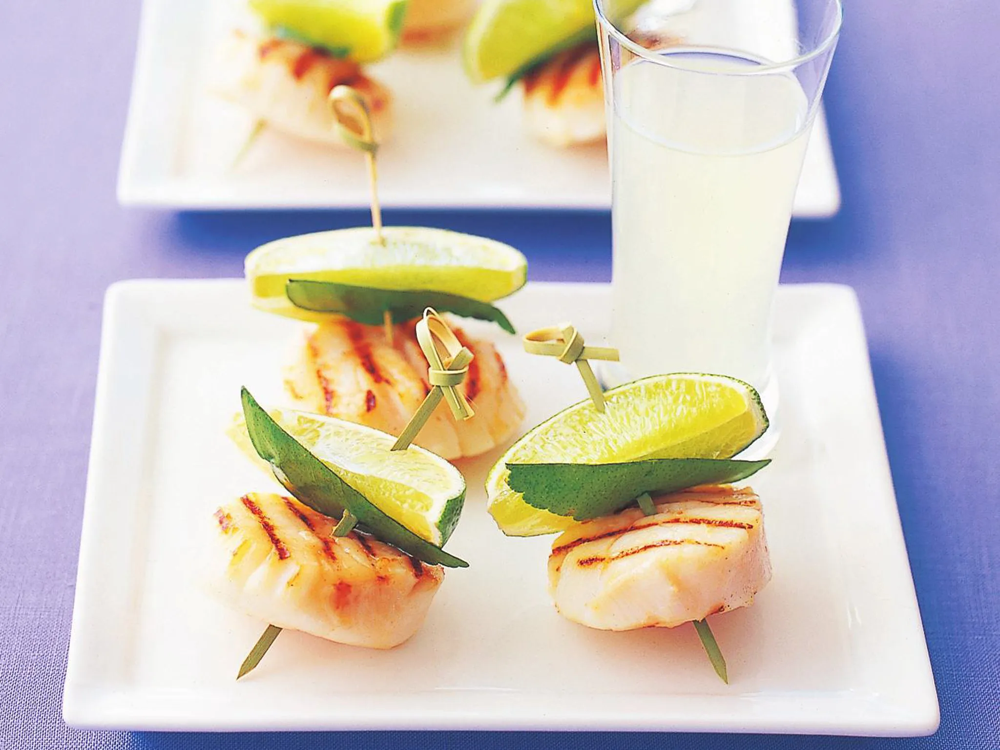 2.Meanwhile, cut each lime into eight wedges. Skewer one lime wedge and one piece of lime leaf onto each toothpick.