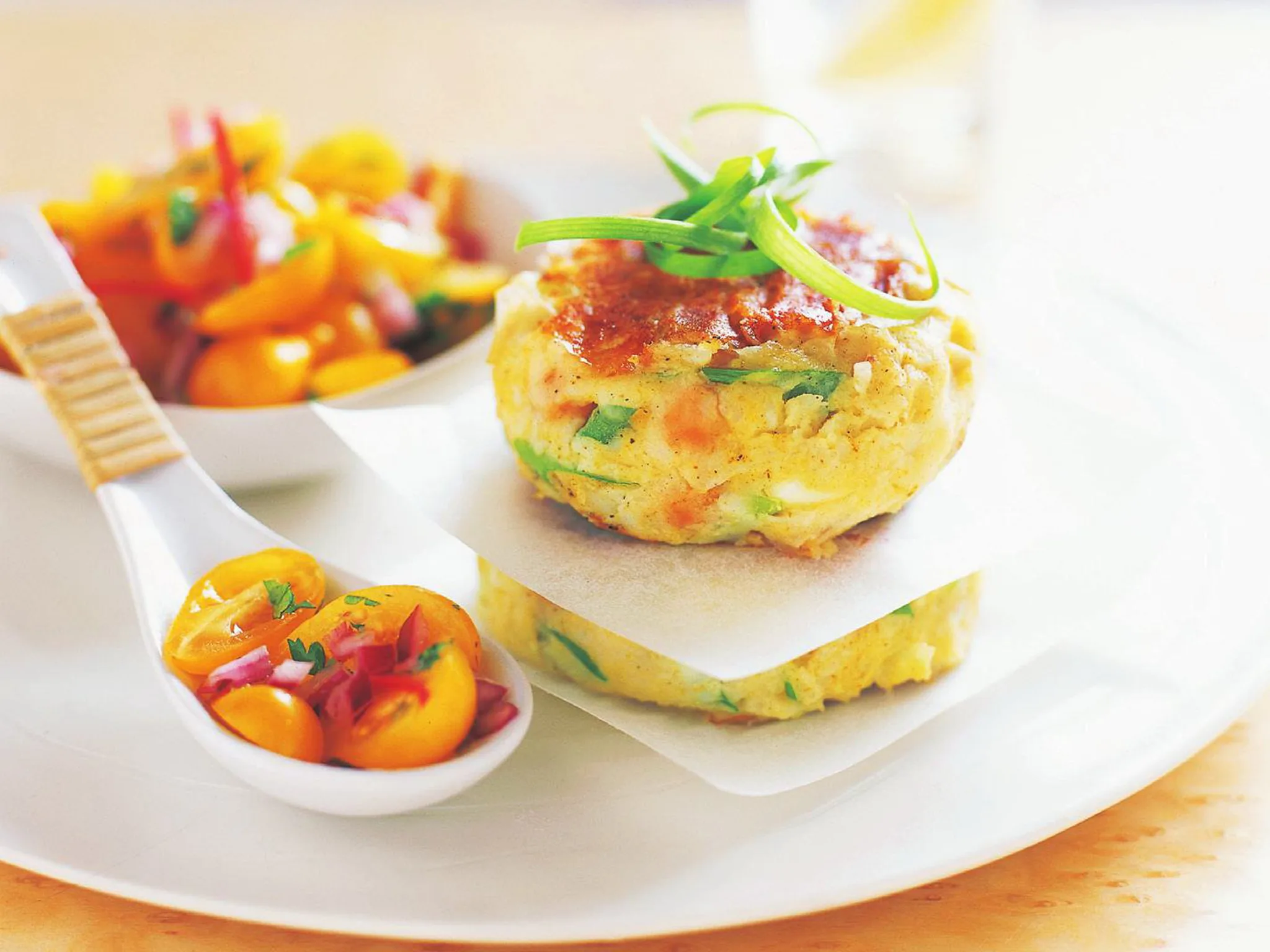 3.Coarsely mash potato in large bowl; stir in remaining ingredients until combined. Using hands, shape potato mixture into eight patties; cook on heated oiled flat plate, uncovered, until heated through.